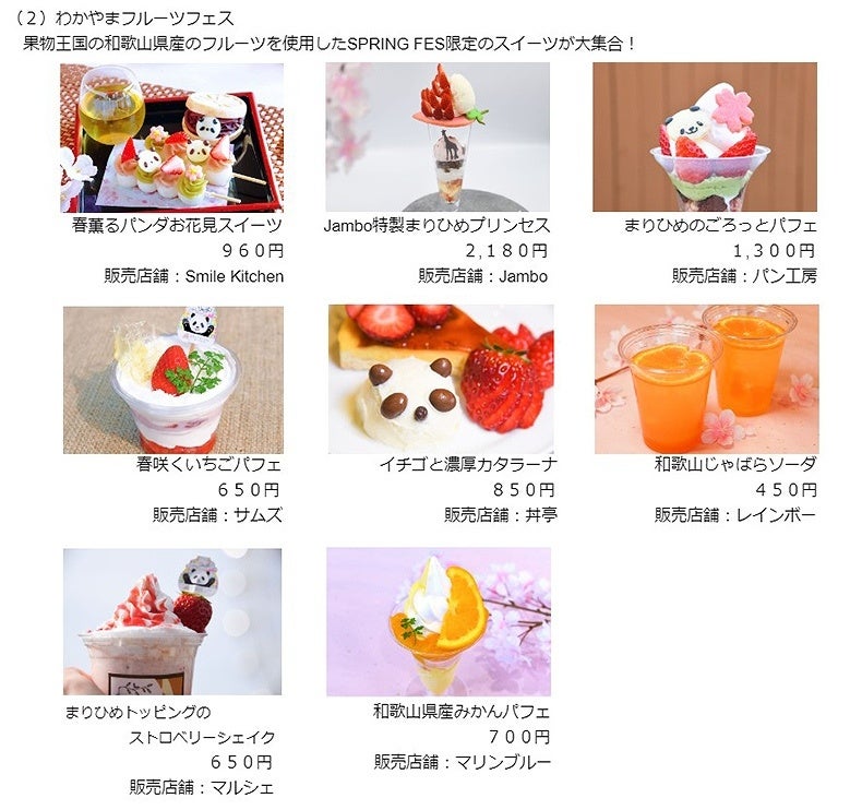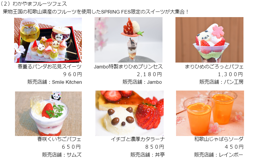 パーク内の飲食店舗では「春を感じるお花見ランチ&わかやまフルーツフェス」を開催します。動物たちと自然を感じながら味わう「お花見ランチ」や「わかやま県産フルーツ」を使った春を感じるスイーツを楽しみましょう。