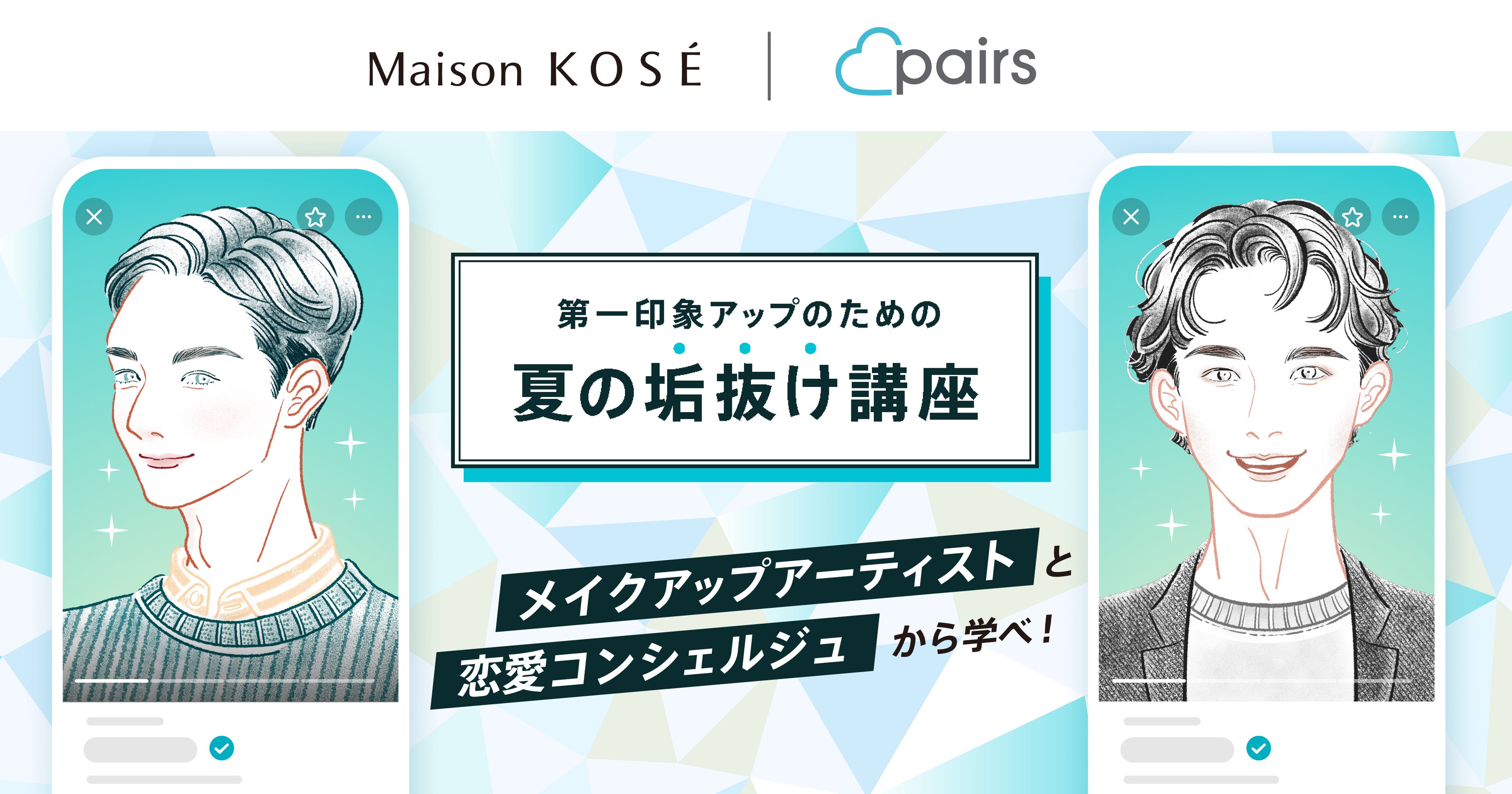 株式会社コーセー(本社:東京都中央区、代表取締役社⻑:⼩林 ⼀俊)のグループ会社、コーセープロビジョン株式会社(本社:東京都中央区、代表取締役社⻑:命尾 泰造)は、恋活・婚活マッチングアプリ「Pairs(ペアーズ)」を運営する株式会社エウレカ(本社:東京都港区、代表取締役CEO:⼭本 ⻯⾺)とコラボレーションし、男性ユーザーを対象に、スキンケアやメイクのレッスンを通じて肌や表情を垢抜けさせることで第⼀印象を向上させることを⽬指したイベントを全3回に分けて開催します。