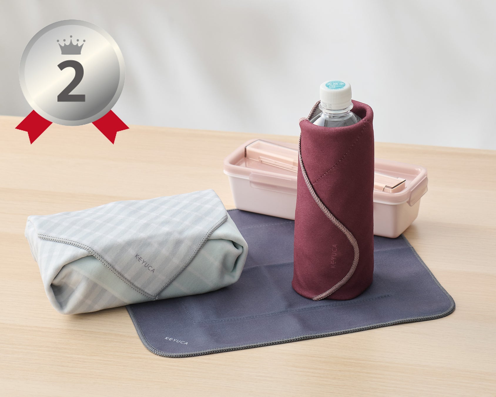 「『結ばない』という発想が良く、ペットボトルやお弁当、お惣菜など形状問わず好きなように包むだけで良いので簡単で使い勝手が抜群です。クロスを重ねるだけでしっかりとくっつき結露しても漏れないのでカバンの中でも安心です」