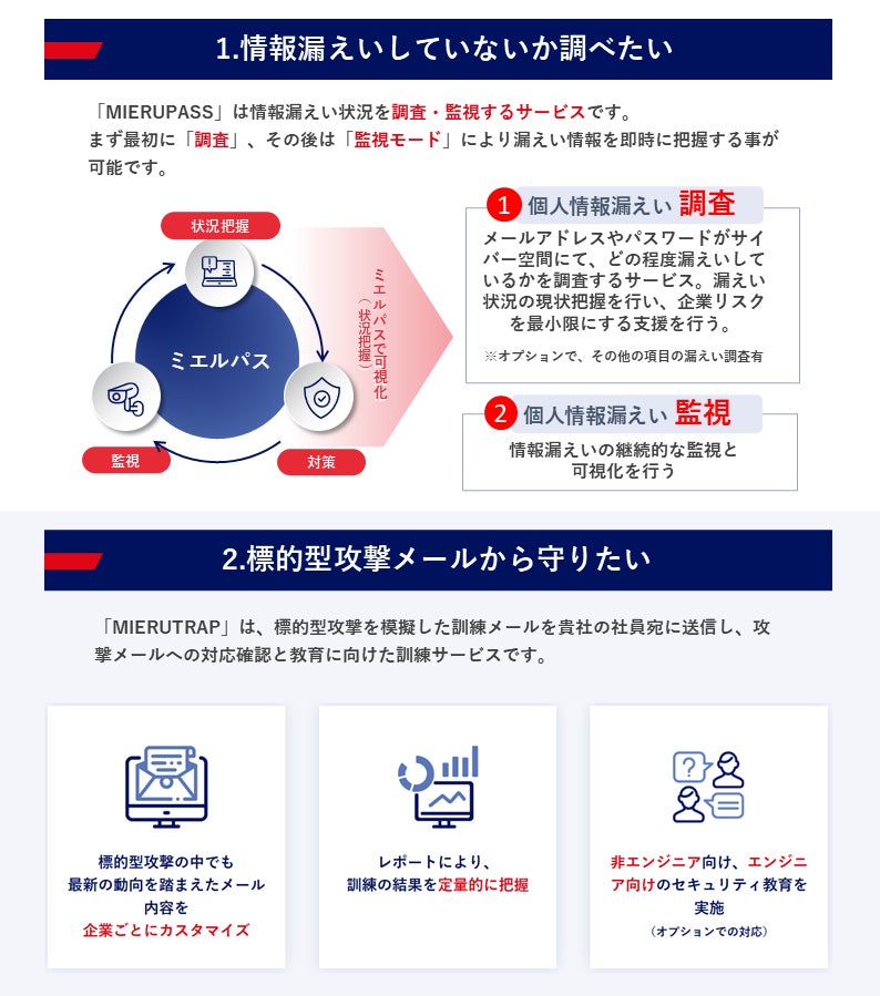 近年、メールアドレスやパスワードの情報漏えいによるトラブルがニュースで取り上げられる中、企業の対策が急務になっています。アイエスエフネットは、サイバーセキュリティを強化したい企業に対し、情報漏えいの現状を調査する「MIERUPASS」と、攻撃メールへの対応確認および教育を目的とした「MIERUTRAP」を提供しています。