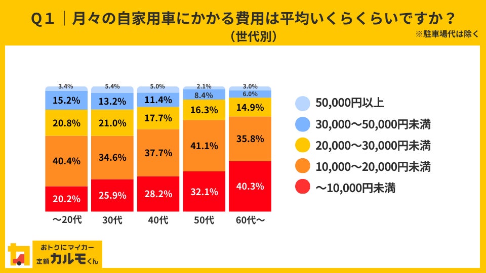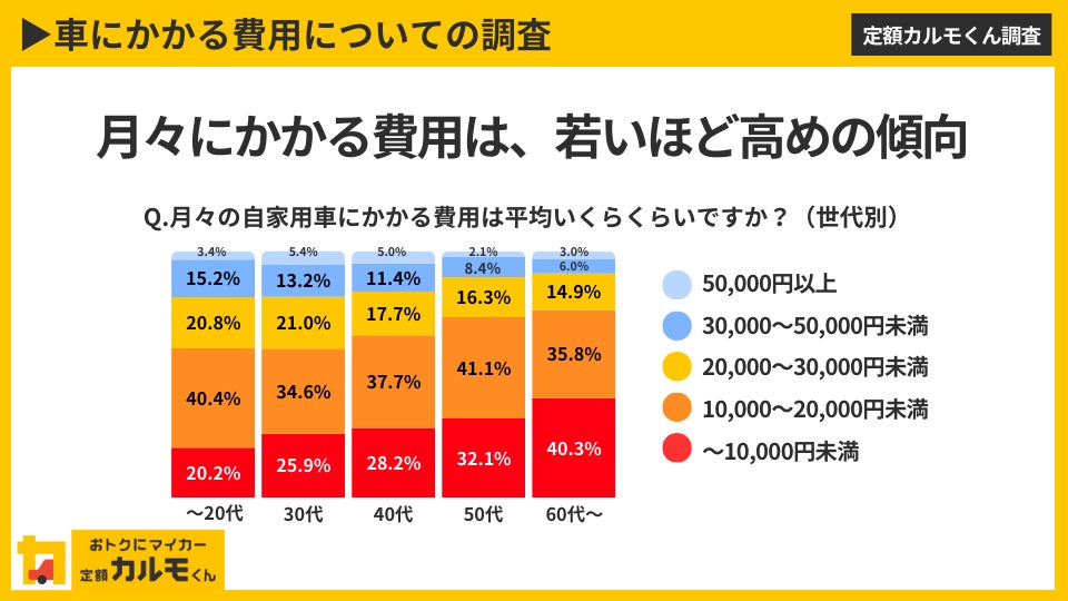 また、世代別で見てみると、月々の自家用車にかかる費用が30,000円以上の方は~20代が一番多い結果となりました。一方で、60代以降では「10,000円未満」と回答する方の割合が最も多く、年代が上がるにつれて自家用車にかける費用が下がっていく傾向がみられます。