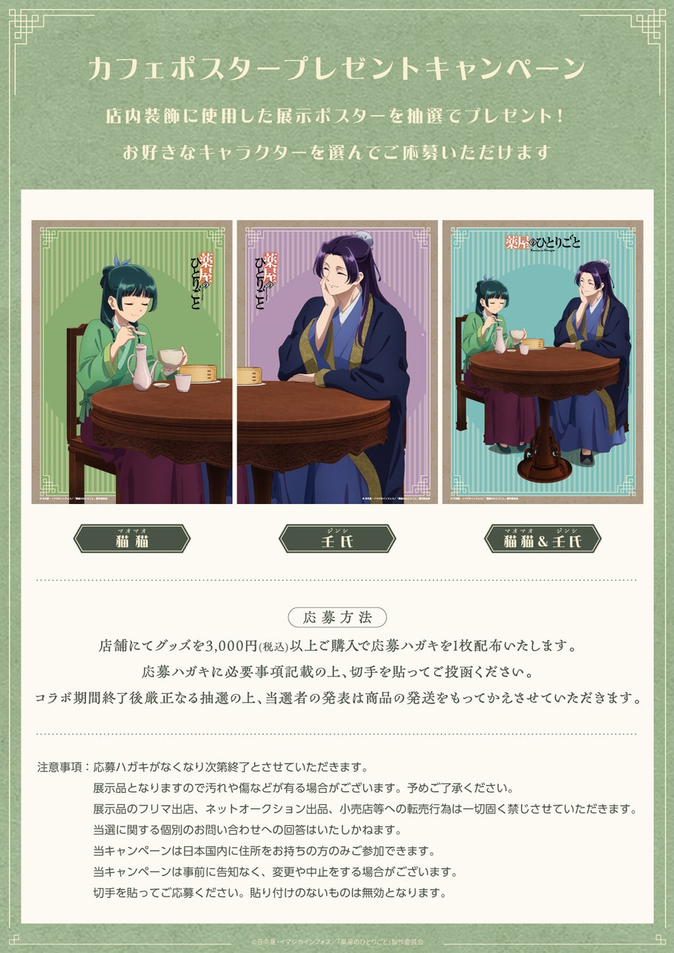 猫猫と壬氏が一緒に食事をしている新規描き下ろしイラストを使用した「アクリルキーホルダー」や、作中で猫猫と羅漢が対局したシャンチーをイメージした「シャンチーボーロ」、通販商品の「BIGペアアクリルスタンド」など様々な新作オリジナルグッズが登場いたします。また、コラボカフェご利用時に3,000円(税込)以上グッズをご購入いただくと、抽選で展示ポスターが当たるキャンペーンにご参加いただけます!