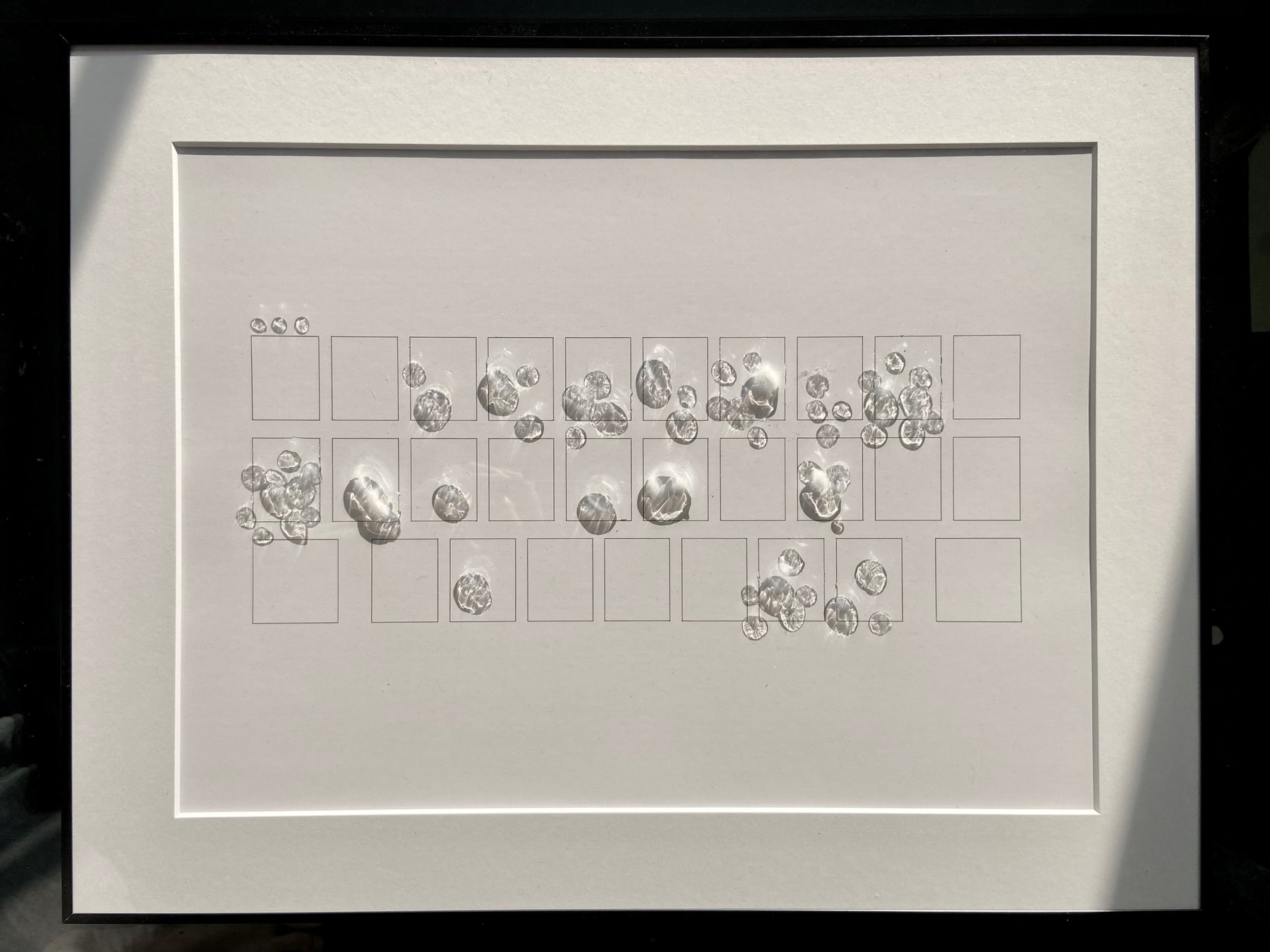 本展では、スマートフォンを媒介とした複数の作品を展示します。キーボードを想起させる画面を支持体に見立て、その上に「タイプする痕跡」を書として残します。スマートフォンの普及により、「画面」は触れて操作する存在へと変化しました。田中は「映像と画面」と「作品と額」の関係を重ね合わせ、画面の意味の変容を額上の痕跡として提示します。