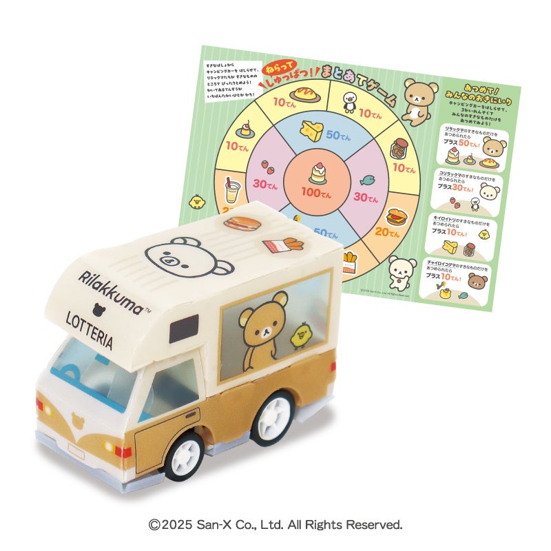 リラックマたちがおでかけしているデザインがかわいい組み立て式のキャンピングカーです。後ろに引いて手を離すと走り出します。リラックマたちの好きなものを集めて得点を競う「ねらってしゅっぱつ!まとあてゲーム」を楽しめる、あそびシート付きです。
