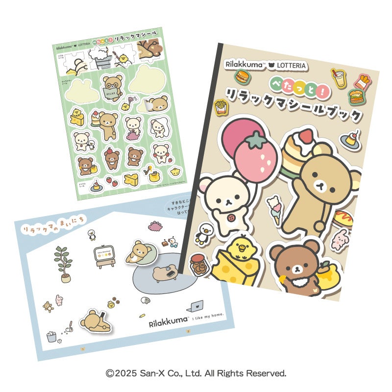 「リラックマおもちゃ」は、様々なポーズのリラックマシールで遊べる「ぺたっと!リラックマシールブック」、リラックマたちのパーツを並べて飾れる「ようこそ!リラックマミニハウス」、組み立てた車でゲームができる「しゅっぱつ!リラックマキャンピングカー」の3種類から1種類をお選びいただけます。
