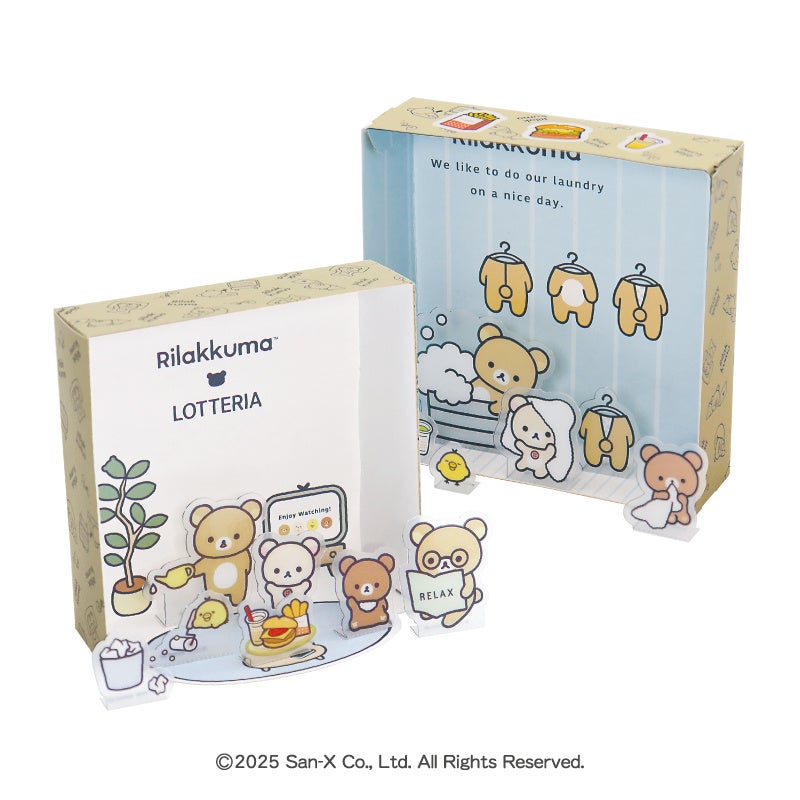 リラックマたちの好きなアイテムやロッテリアのメニューなど、たくさんのキャラクターパーツが付いた箱型のジオラマです。背景はリラックマたちがくつろぐ「おうち」と「おふろ」の2種類。パーツを並べて飾ったり、ごっこ遊びをしたり、いろいろな遊び方で楽しめます。
