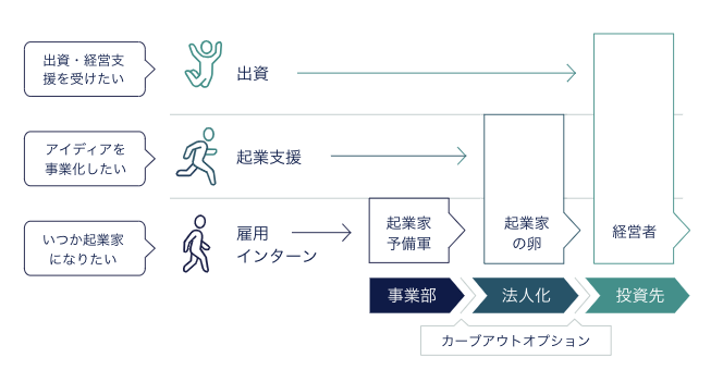 ※:スタートアップスタジオとは、同時多発的に複数の企業を立ち上げる組織を指します。出資・事業開発・エンジニアリング・バックオフィスの支援を用意し、初めての起業でも成功率を高めることが可能です。