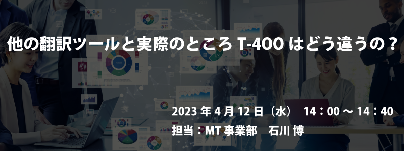 高精度AI自動翻訳の開発・運営を行う株式会社ロゼッタ(本社:東京都千代田区 代表取締役:渡邊 麻呂)は、無料ウェビナー『他の翻訳ツールと実際のところT-4OOはどう違うの?』を2023年4月12日(水)に開催いたします。