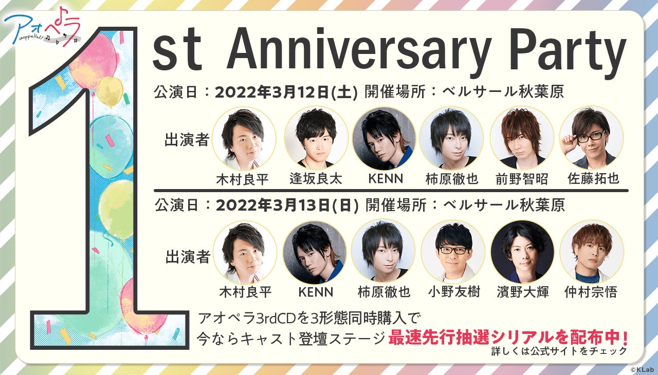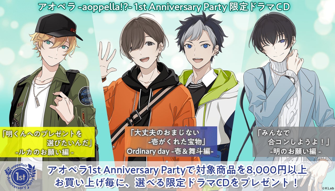 詳細は『アオペラ』公式サイトの『アオペラ -aoppella!?- 1st Anniversary Party』特設ページをご参照下さい。