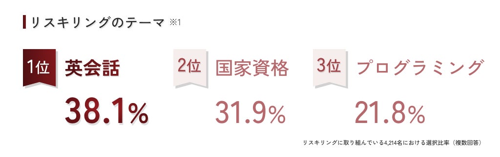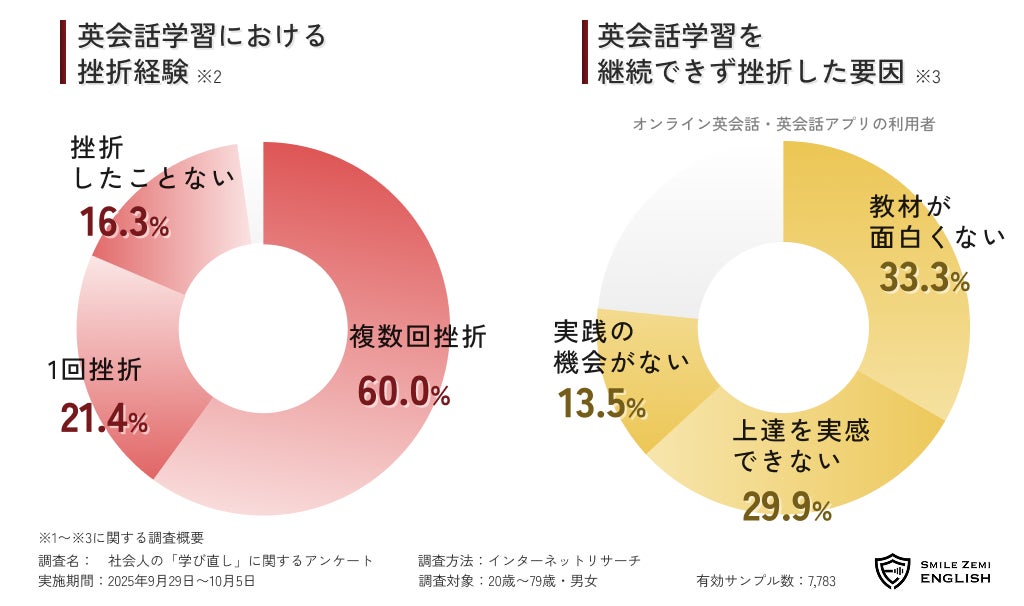 英会話は社会人の学び直しにおいて、学習者割合が38.1%と最も人気のあるテーマ(※1)ですが、日本人の英会話力は依然として高いとは言えないのが実状です。社会人になってから英会話を学び直した人の81.4%が継続できずに挫折を経験しており(※2)、その要因は「教材が面白くない」「上達を実感できない」「実践の機会がない」という3つに集約されます。(※3)