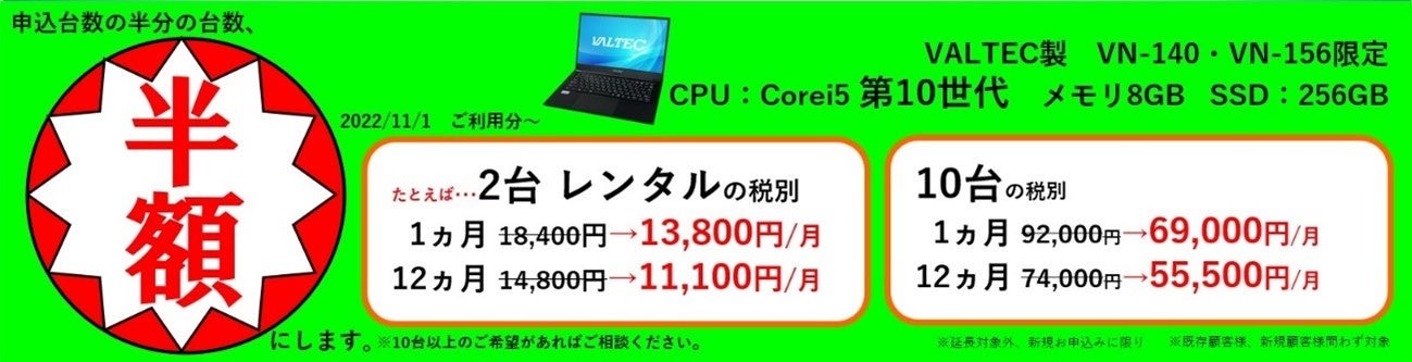 株式会社バルテック(本社:東京都新宿区、代表取締役 吉江秀馨 以下、バルテック)のグループ会社、スマートレンダー株式会社(本社:東京都新宿区、代表取締役 前田 実 以下、スマートレンダ-)が運営する法人パソコンレンタルサイト「スマレンタル」。複数台申込いただいたお客様を対象に、2台目のレンタル料金が半額になるキャンペーンを開始します。