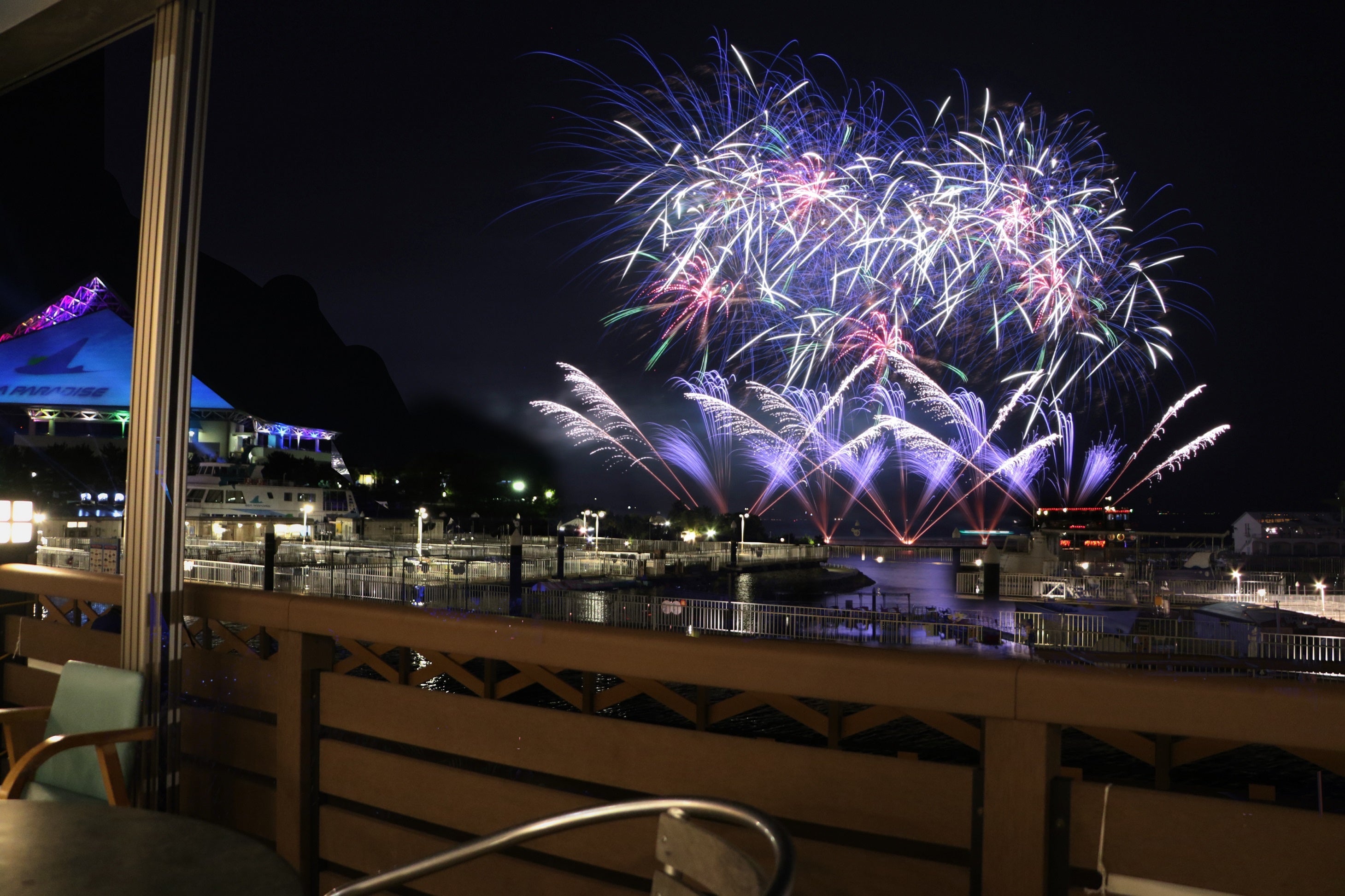 水族館「うみファーム」では、「花火シンフォニア」を間近でご覧いただける特別観覧席券を販売いたします。目の前に海と空が広がり、最前列で視界いっぱいに広がる大迫力の花火をお楽しみいただけます。