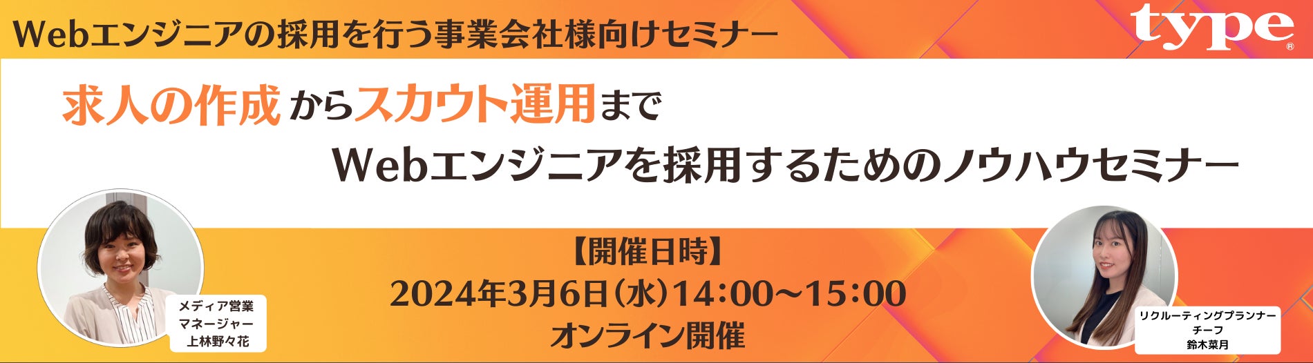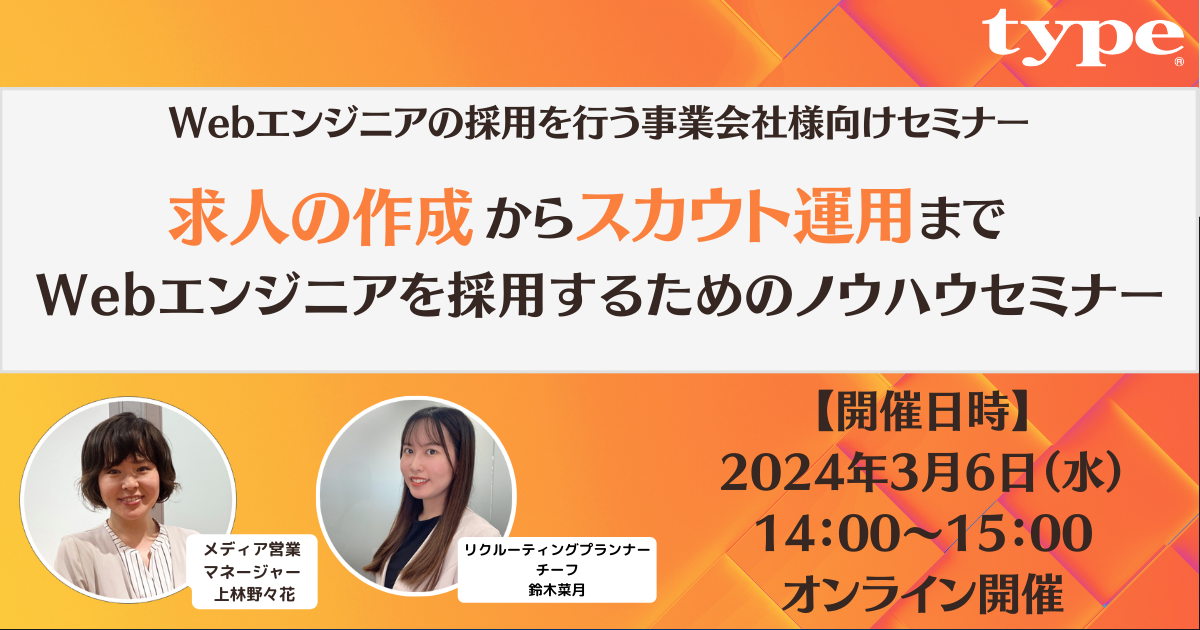 【見逃し配信の特典あり】|【Webエンジニア採用を行う事業会社様向け】求人の作成からスカウト運用まで!Webエンジニアを採用するためのノウハウセミナー|3/6(水)type人事担当者様向けセミナー