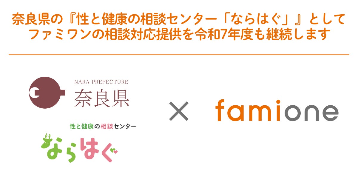 「子どもを願うすべての人によりそい 幸せな人生を歩める社会をつくる」をビジョンに掲げ、法人の従業員向け福利厚生や自治体の住民向け支援を行うヘルスケアサポートサービス「ファミワン」 https://famione.com/benefit/などを展開する株式会社ファミワン(本社:東京都渋谷区、代表取締役:石川勇介)は、昨年度から奈良県(県知事:山下 真、以下 奈良県)の『性と健康の相談センター「ならはぐ」』の委託を受けて対応している、県民の方への妊娠や出産、性・生殖等に関する悩みをもつ方へのオンライン相談対応を、令和7年度も継続することが決定しました。