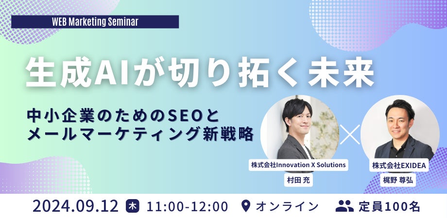 株式会社イノベーション(東証グロース 証券コード3970)のグループ会社である、株式会社Innovation X Solutions(本社:東京都渋谷区、代表取締役社長:遠藤俊一、以下「Innovation X Solutions」)は、2024年9月12日(木「生成AIが切り拓く未来:中小企業のためのSEO / メールマーケティング新戦略」をテーマに株式会社EXIDEAと共催セミナーを開催します。