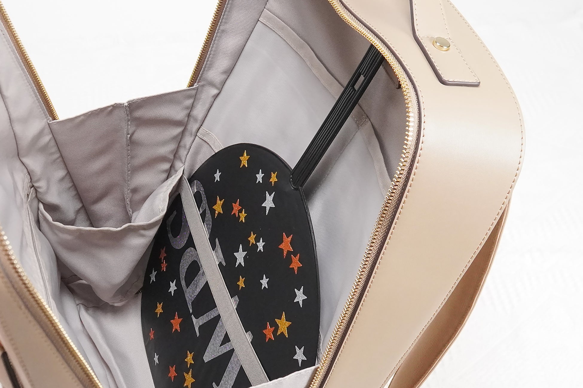 推し活グッズや着替えなどが収納できる大容量スペースになっていて、お仕事終わりに推し活現場へ直行する場合も安心です。ペンライトや双眼鏡が収納できるボトルホルダーや、中身が一目でわかるメッシュポケットが付いています。マチがあるため、普段はお弁当やメイクポーチの収納に役立ちます。