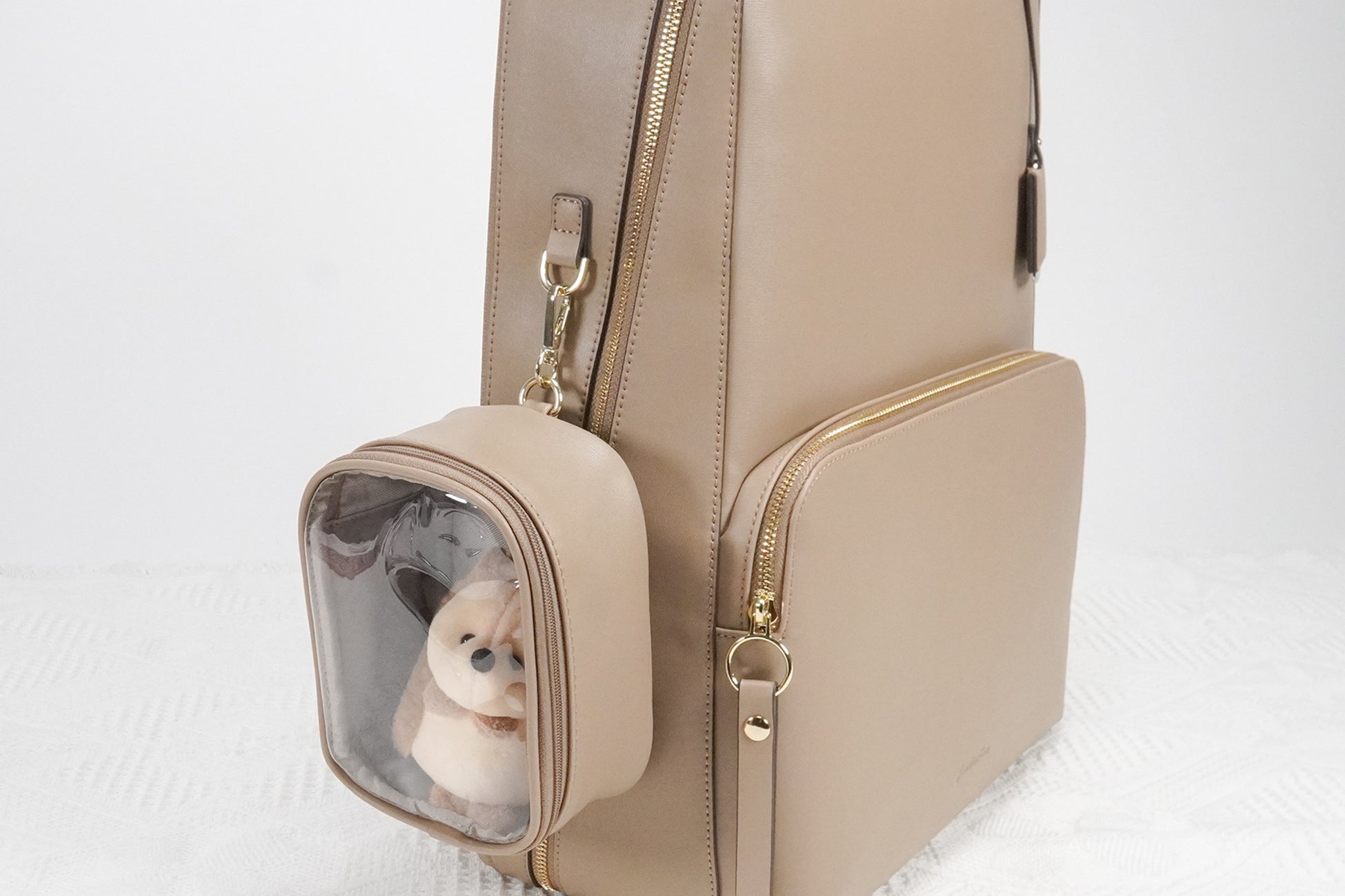 推し活用のぬいぐるみ収納に最適な、取り外しできる「推しぬいポーチ」が付属します。お仕事中はバッグに忍ばせ、会場付近ではリュックサイドに取り付け可能です。リュックサイドに配置した金具は「推しぬいポーチ」以外に、キーホルダーなどのグッズやパスケースの取り付けに活用できます。