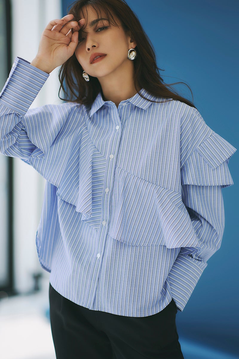 ■特長:ベーシックなストライプ柄のシンプルシャツに贅沢にフリルをあしらったフェミニンの新定番ブラウス。パンツやデニムを合わせた着こなしも楽しめます。