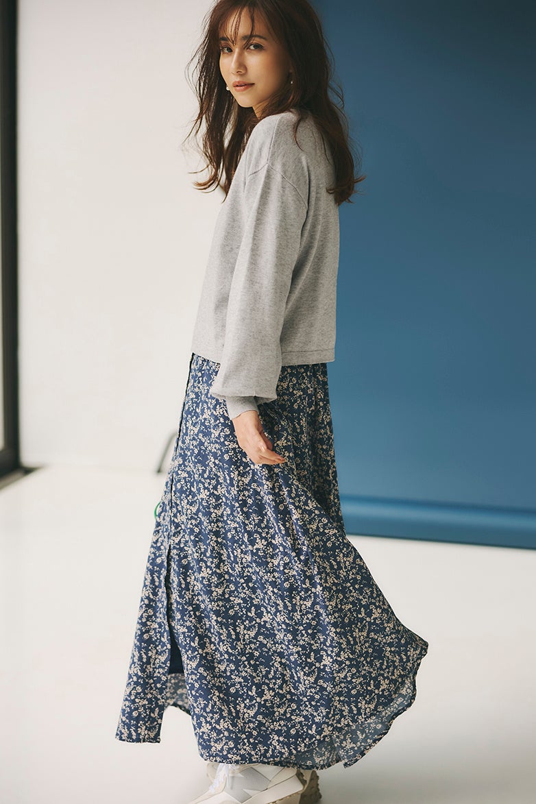 ■特長:ニュアンスのある小花柄のロングワンピースとシンプルなニットプルオーバーのアンサンブル。3通りの着こなしがお楽しみいただけます。