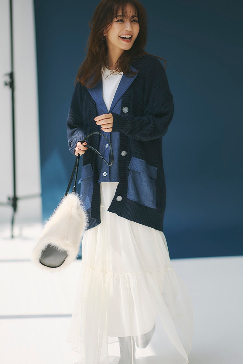 ■特長:薄手デニムジャケットにニットカーディガンを羽織ったようなレイヤードスタイルが1枚で叶うドッキングジャケット。スカートスタイリングにも合います。