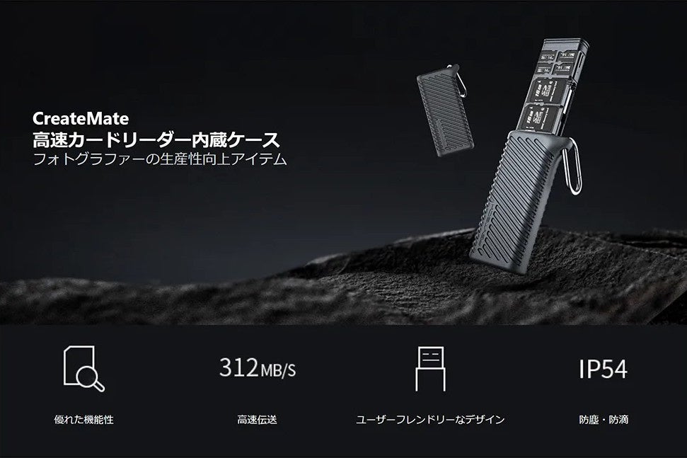 高速データ通信を可能としたメモリーカードリーダー機能と、携帯用のカードケースの2つの役割を、1つにまとめたフォトグラファー必携アイテム。