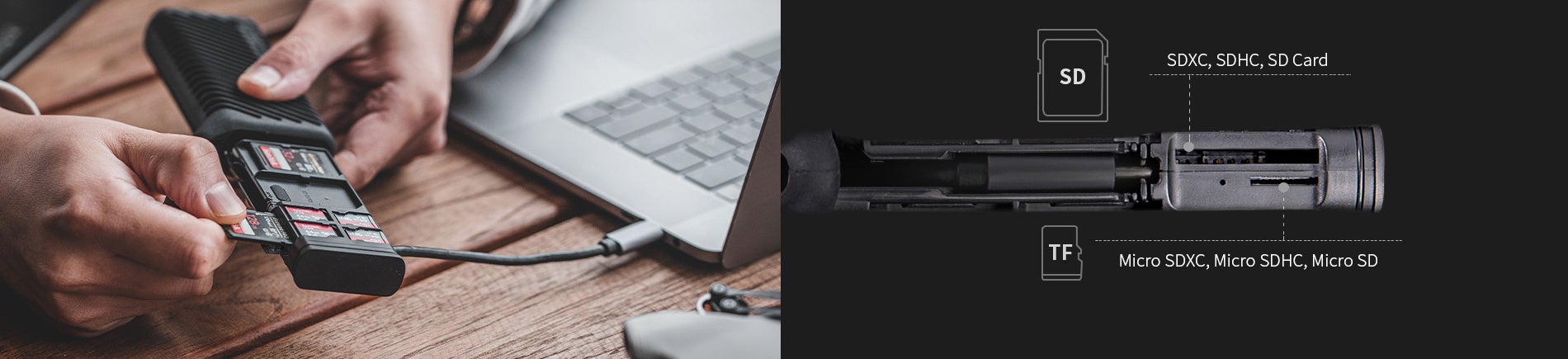 USB3.1を採用し、データ転送速度「312MB/s」を実現。SD・TF(microSD)のデュアルスロットは、「UHS-II」「UHS-I」「非UHS」「TF(microSD)」に対応。