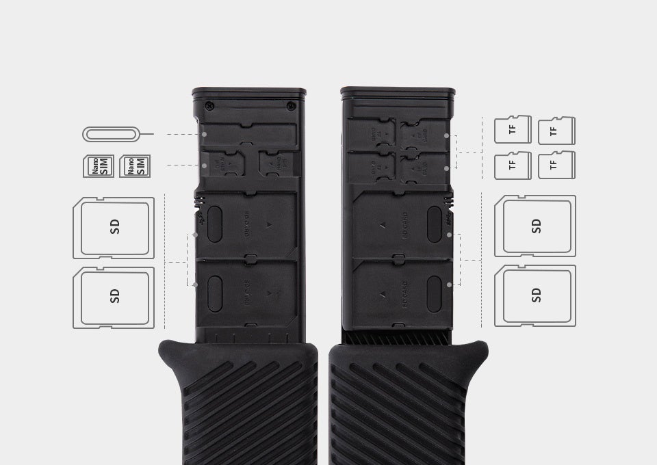 SDカード:4枚、microSDカード:4枚、Nano SIMカード:2枚、イジェクトピン、リーダー用ケーブルを効率的に収納。