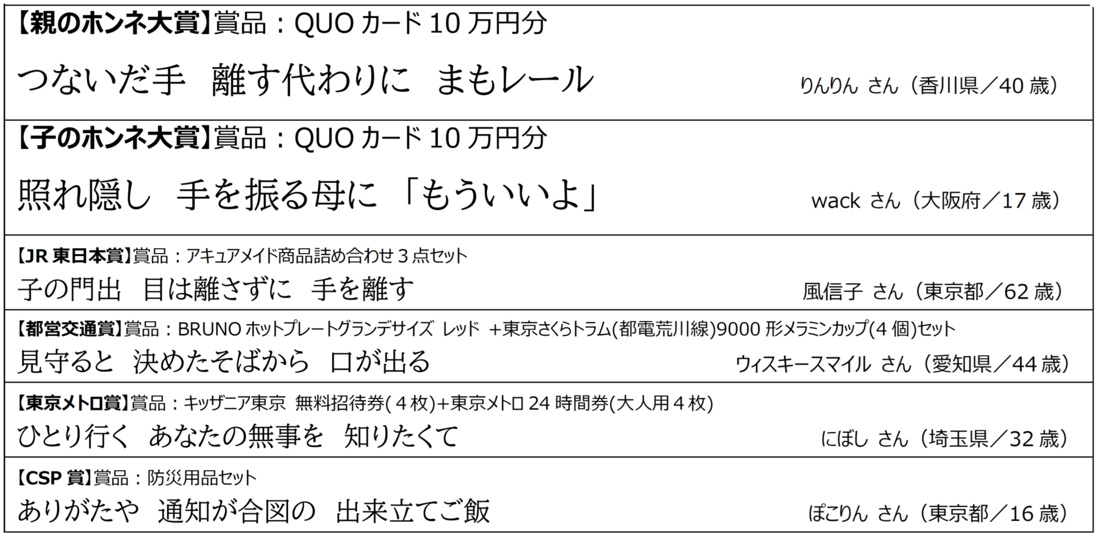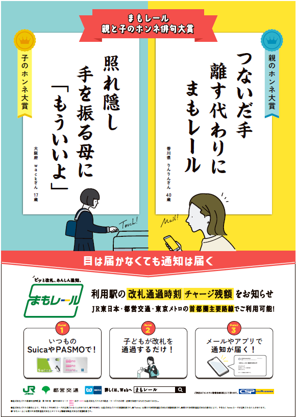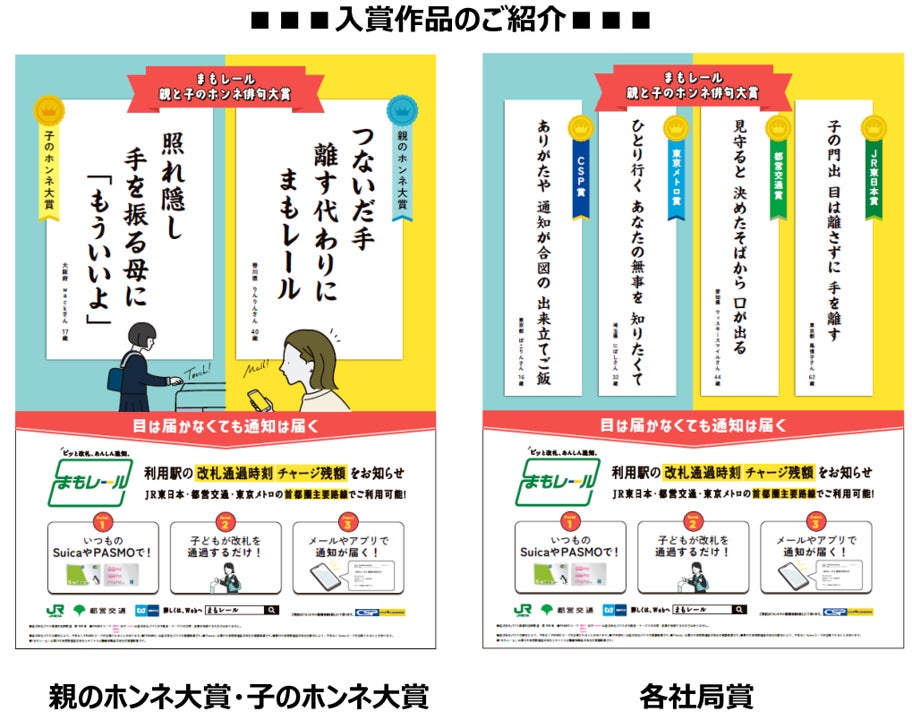 | ●東日本旅客鉄道株式会社(以下「JR東日本」)、東京都交通局(以下「都営交通」)、東京地下鉄株式会社(以下「東京メトロ」)とセントラル警備保障株式会社(以下「CSP」)は共同で提供する「改札通過通知サービス 『まもレール』」 に関連した、第2回「親と子のホンネ俳句大賞」を開催し、2022年11月21日~2023年1月9日までの間で、子どもから大人まで多くの方にご応募いただき、第1回を上回る6,758作品が集まりました。 ●このたび、ご応募いただいた作品の中から事務局による厳正な審査を行い、入賞作品6句を決定いたしました。 ●入賞作品6句は、JR東日本、都営交通、東京メトロの主要駅へポスターとして掲出します。 ●さらに本企画を応援してくださる皆さまに感謝を込めてTwitterフォロー&リツイートキャンペーンを実施します。 |