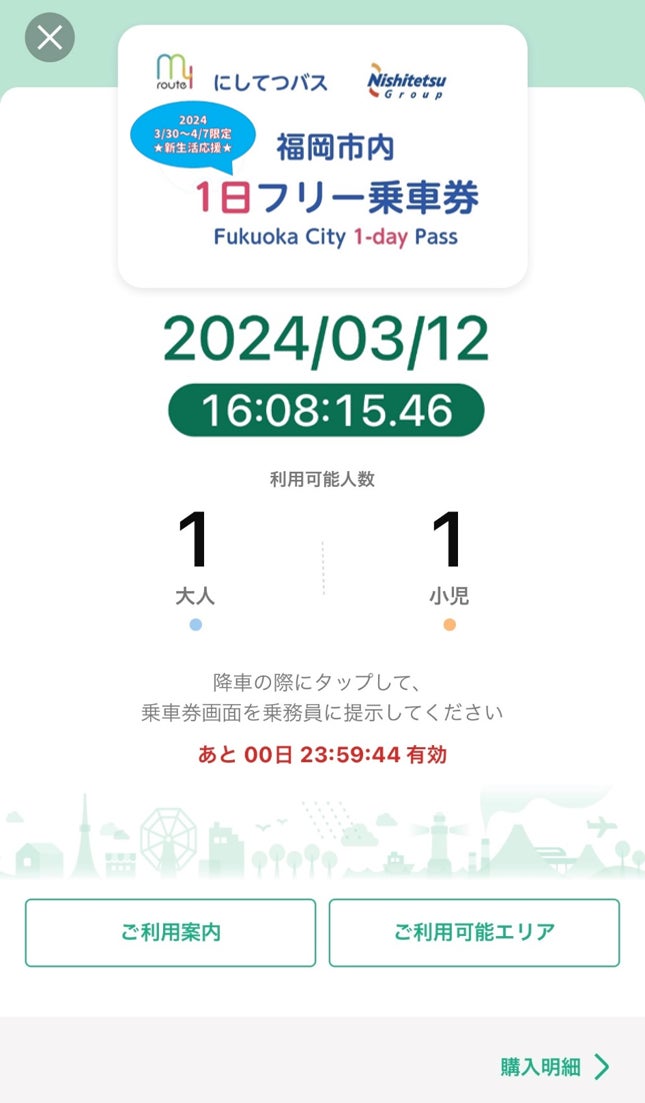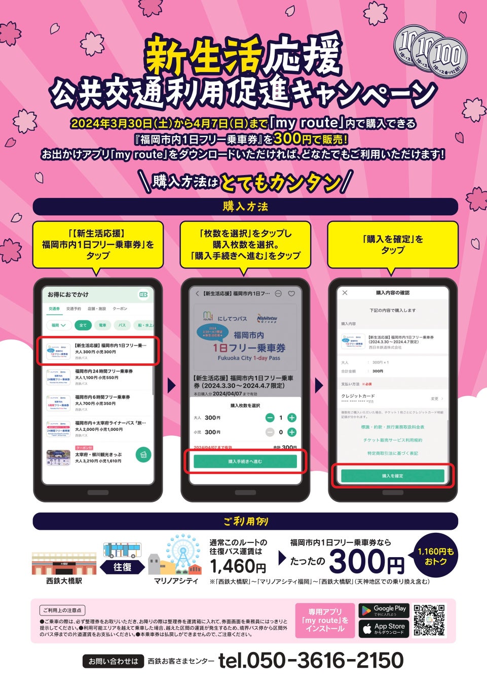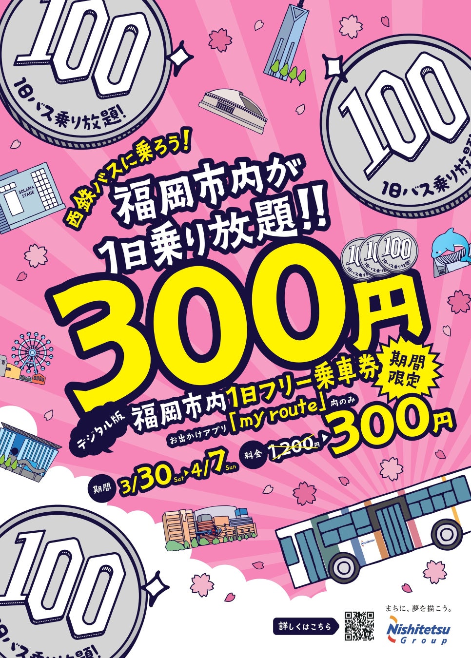 期間限定で、「my route」内で使用できる『西鉄バス 福岡市内1日フリー乗車券』を300円で販売するもの