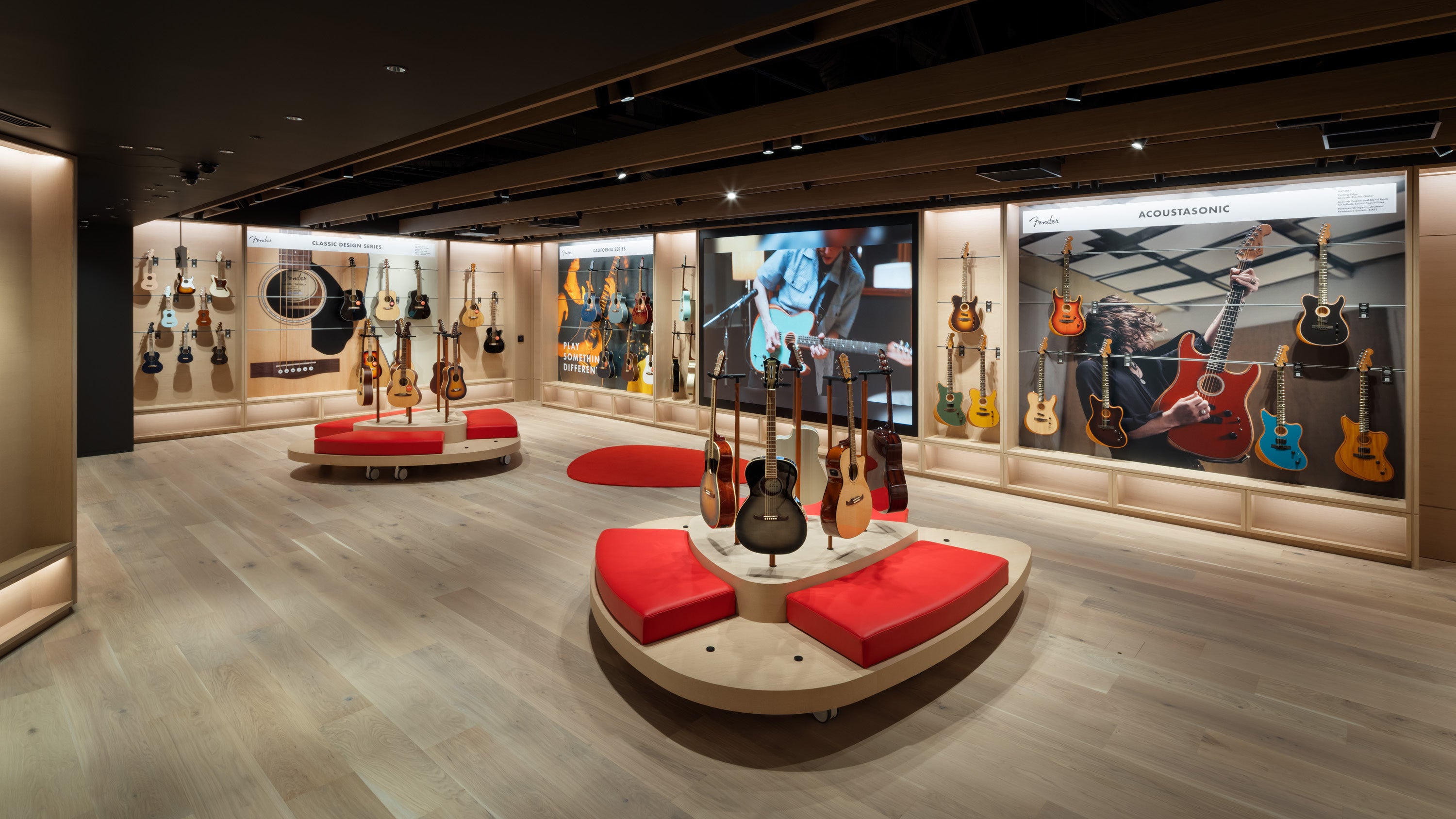 Fender Flagship Tokyoは、国内外で高い評価を受けているクライン ダイサム アーキテクツ (Klein Dytham architecture, KDa) がデザインを手掛けました。2023年6月に東京・原宿にオープンしたこの旗艦店は、全4フロアにわたり、現代の多様なプレイヤーのニーズに応える楽器製品とともに、体験型の空間を提供しています。楽器の展示販売だけでなく、アパレルの取り扱いやイベントを通してフェンダーのランドに没入でき、ギター未経験者にもアプローチしやすく、フェンダーの職人技やその伝統にも触れることができる、音楽体験とデザインが融合したフェンダーならではの空間となっています。
