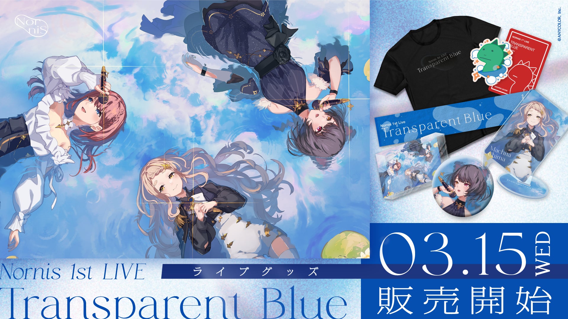 「Nornis 1st LIVE -Transparent Blue-」ライブグッズは、2023年3月15日(水)10時からにじさんじオフィシャルストア(https://shop.nijisanji.jp/)にて販売を開始いたします。