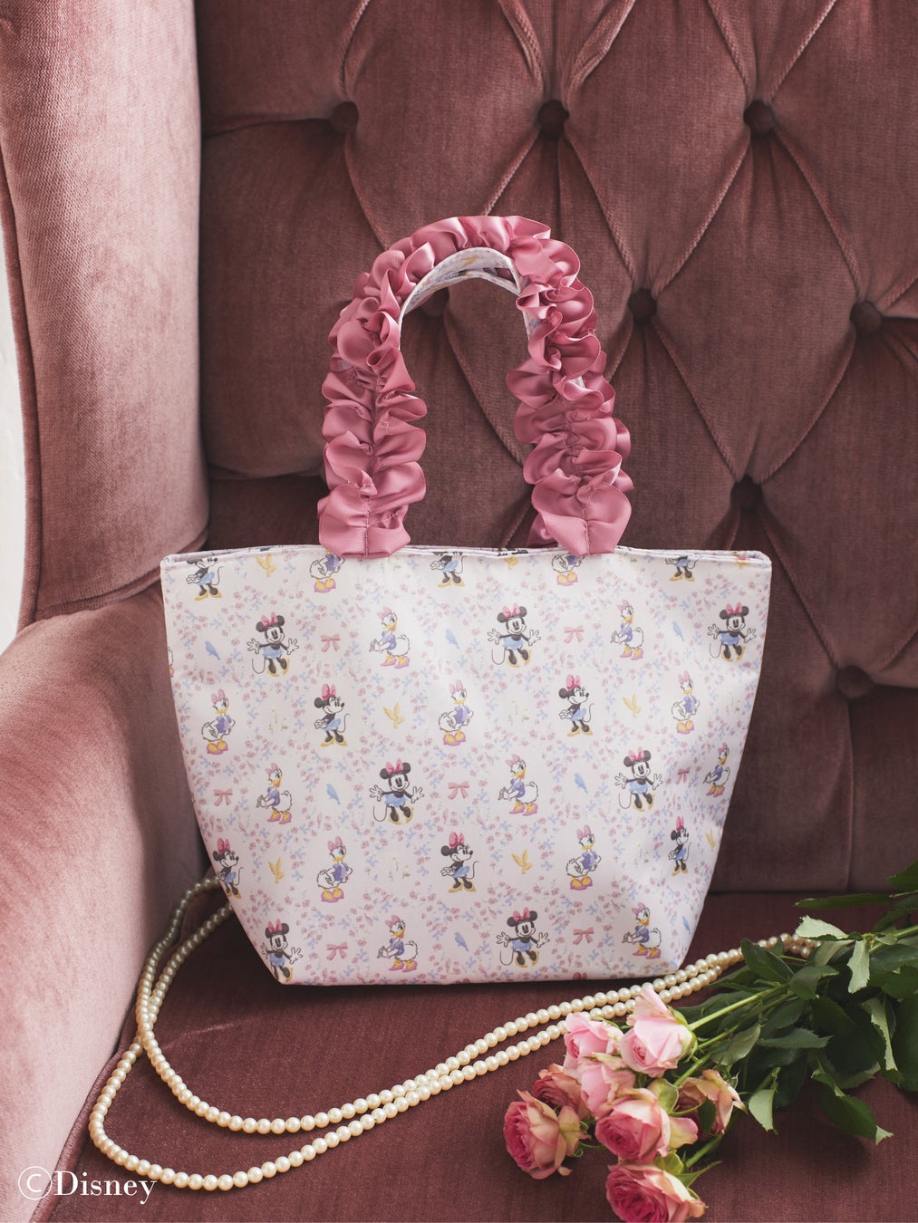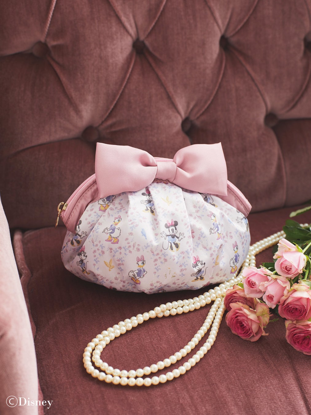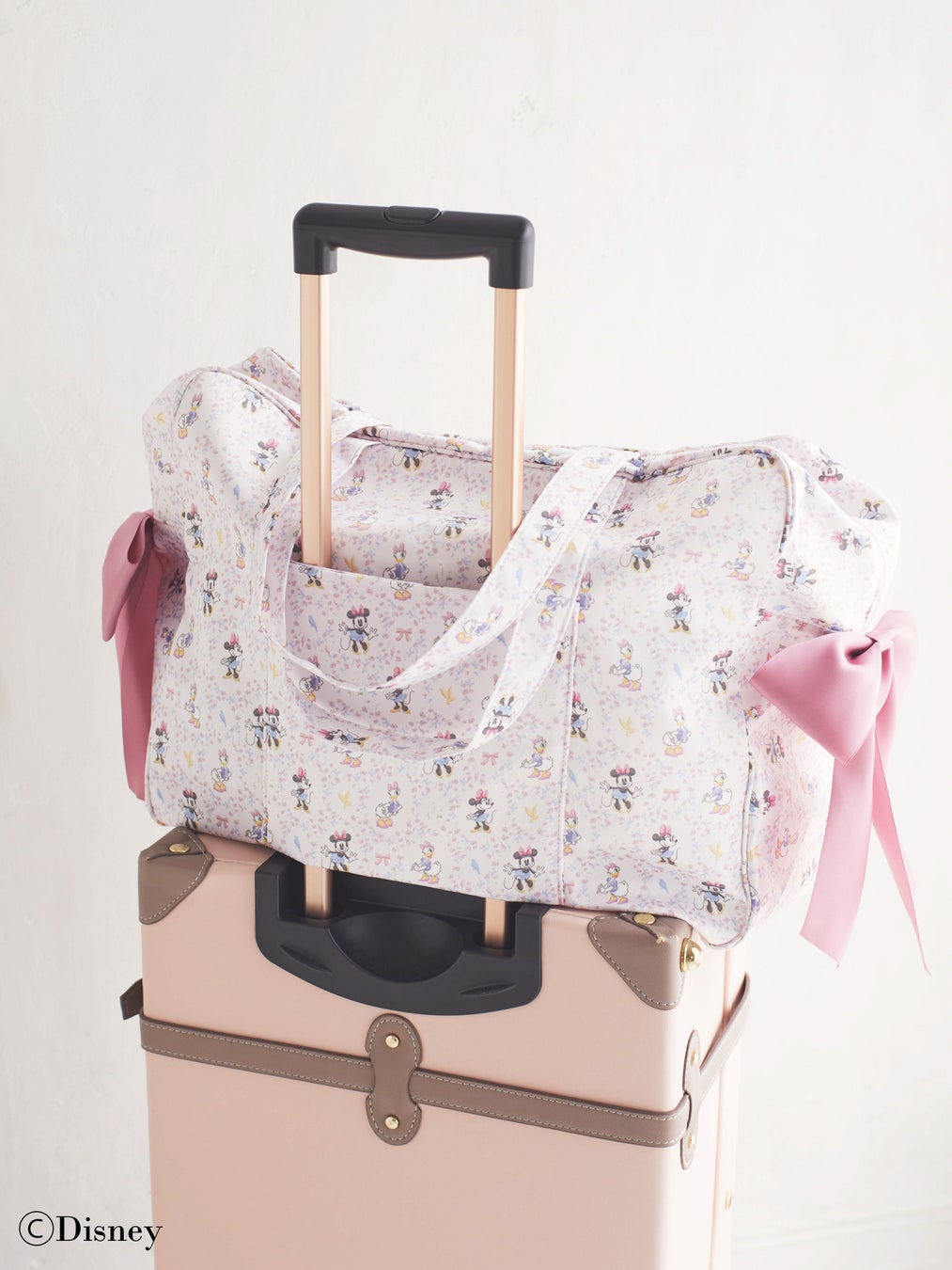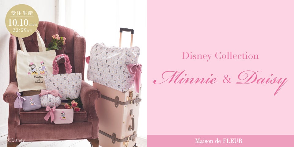 本コレクションでは、ブランド9周年のテーマであるリボンと、ブランド名のFLEUR(フルール)を意味する花を組み合わせ、キャラクターのイメージカラーのピンクとラベンダーを基調としたアイテムを展開。「ミニーマウス」と「デイジーダック」がリボンやお花に囲まれた可愛らしい総柄プリントのアイテムは、ブランド人気のフリルハンドルトートバッグやリボンポーチに加え、旅行に活躍するキャリーオンバッグをご用意いたしました。お出掛け時にシリーズでお使いいただくのもおすすめです。