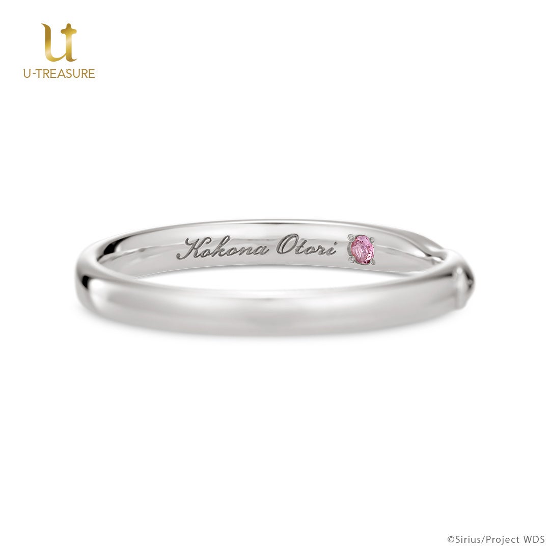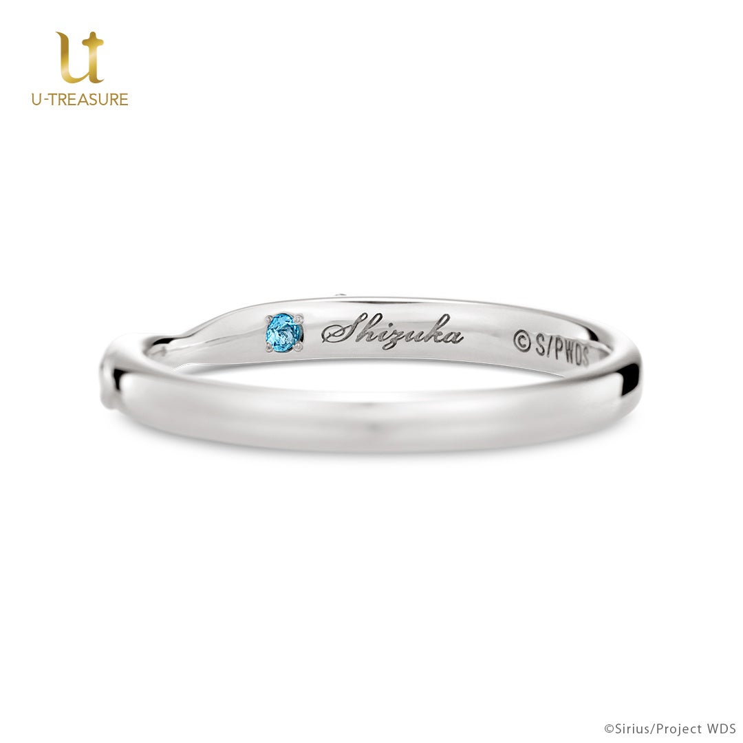 このたびの新作は、それぞれのイメージや衣装をデザインに落とし込んだリング(指輪)です。「劇団シリウス」の『鳳 ここな』&『静香』はメビウスの輪、『カトリナ・グリーベル』はリボン、『新妻 八恵』はフリルをデザインし、内側には天然石と名前の刻印をあしらいました。