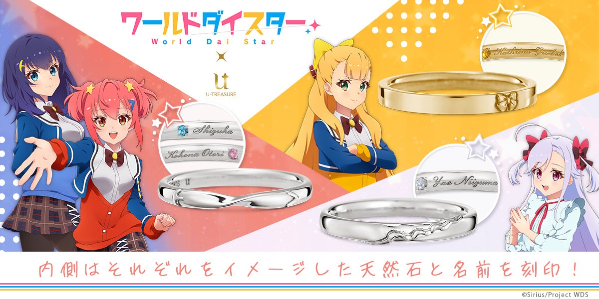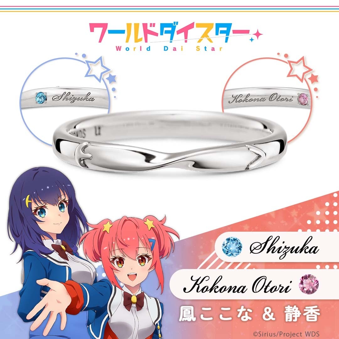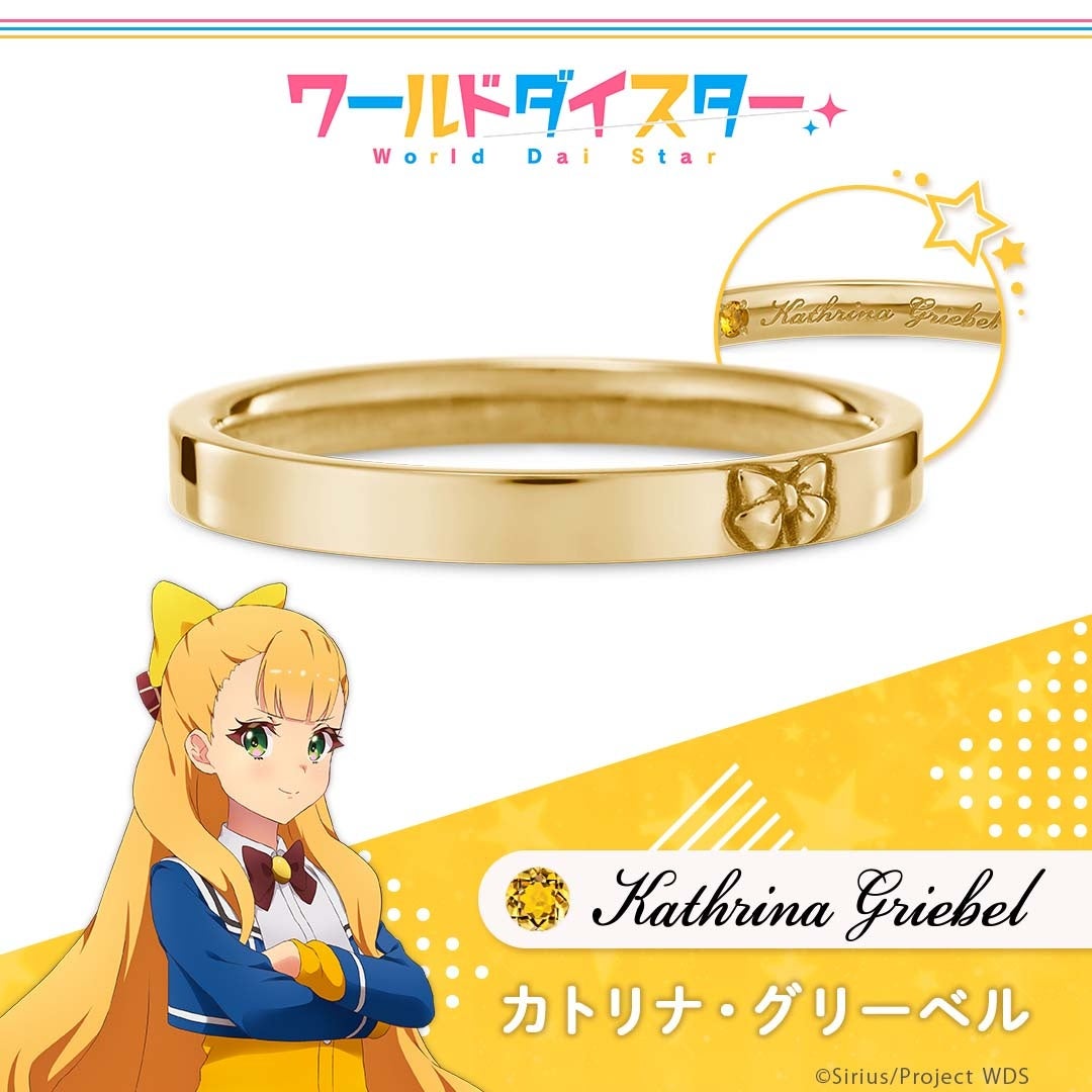 「ワールドダイスター」イメージリング(指輪)『鳳 ここな&静香』『カトリナ・グリーベル』『新妻 八恵』の3種類。それぞれをイメージしたデザイン、内側に天然石と名前を刻印。10月11日(水)まで予約受付