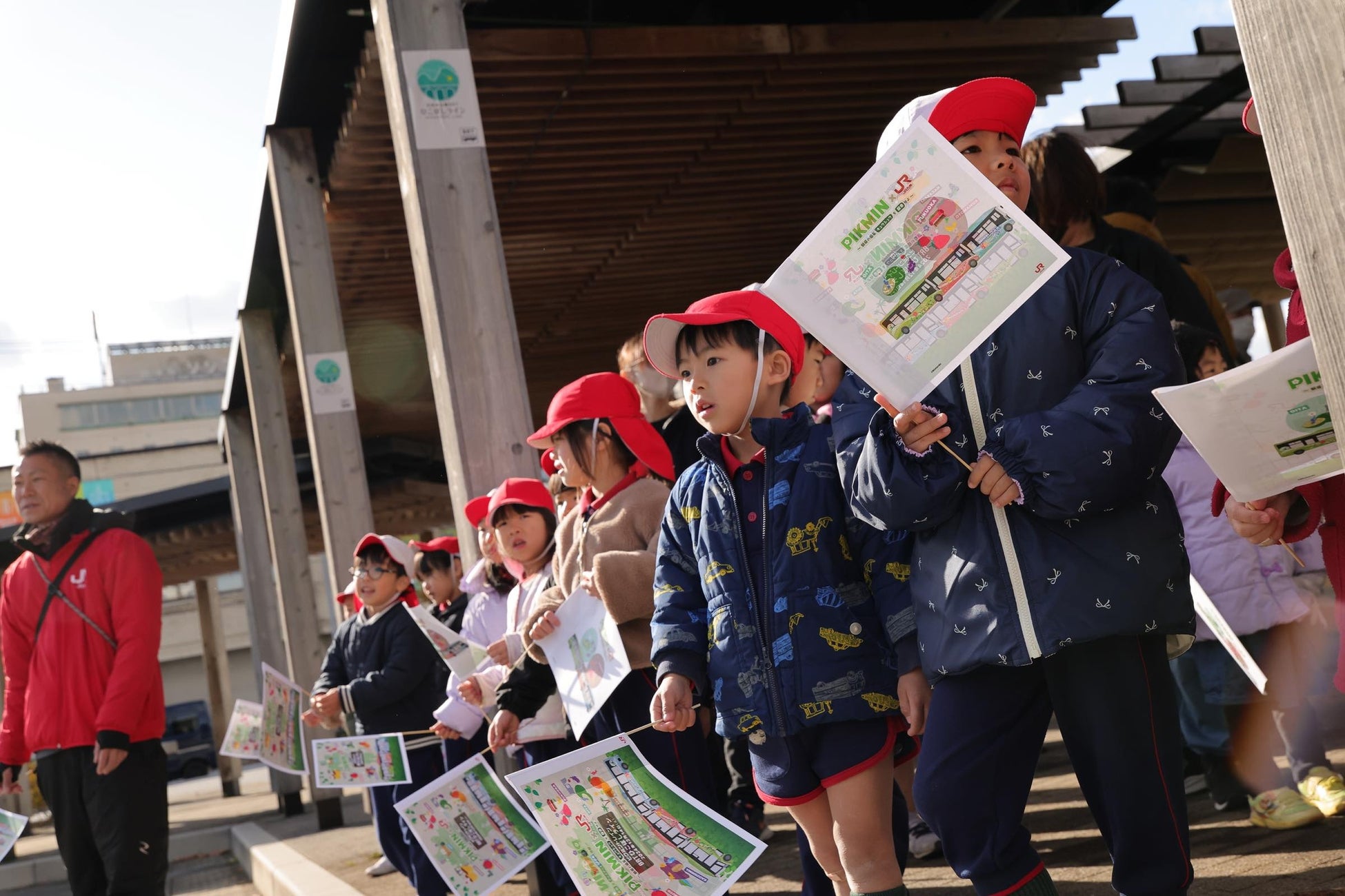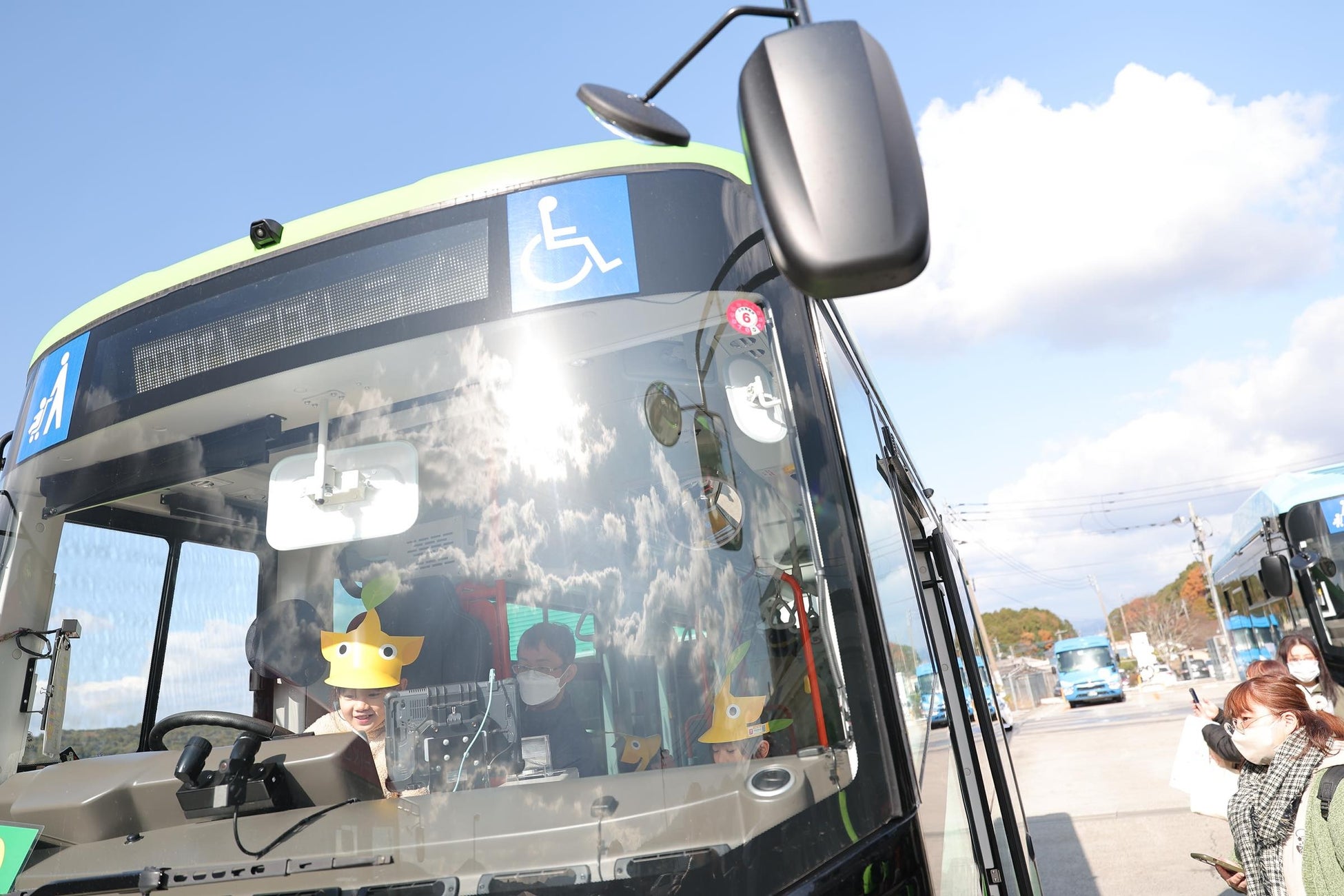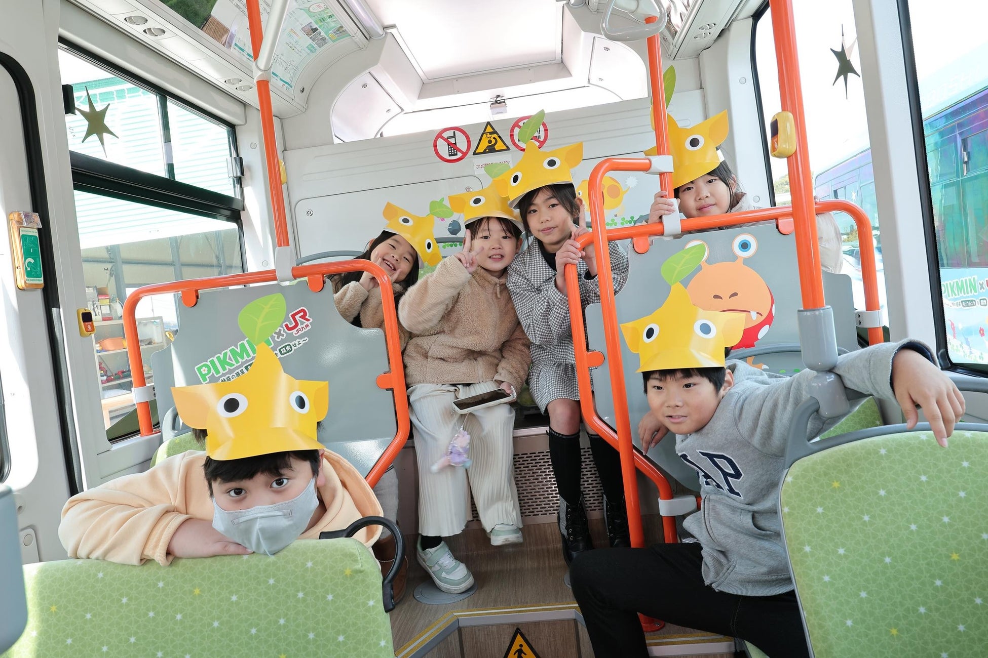 イベントでは、ピクミンのサンバイザーをかぶった沿線の小学生が、それぞれの地域カラーのバスへラ