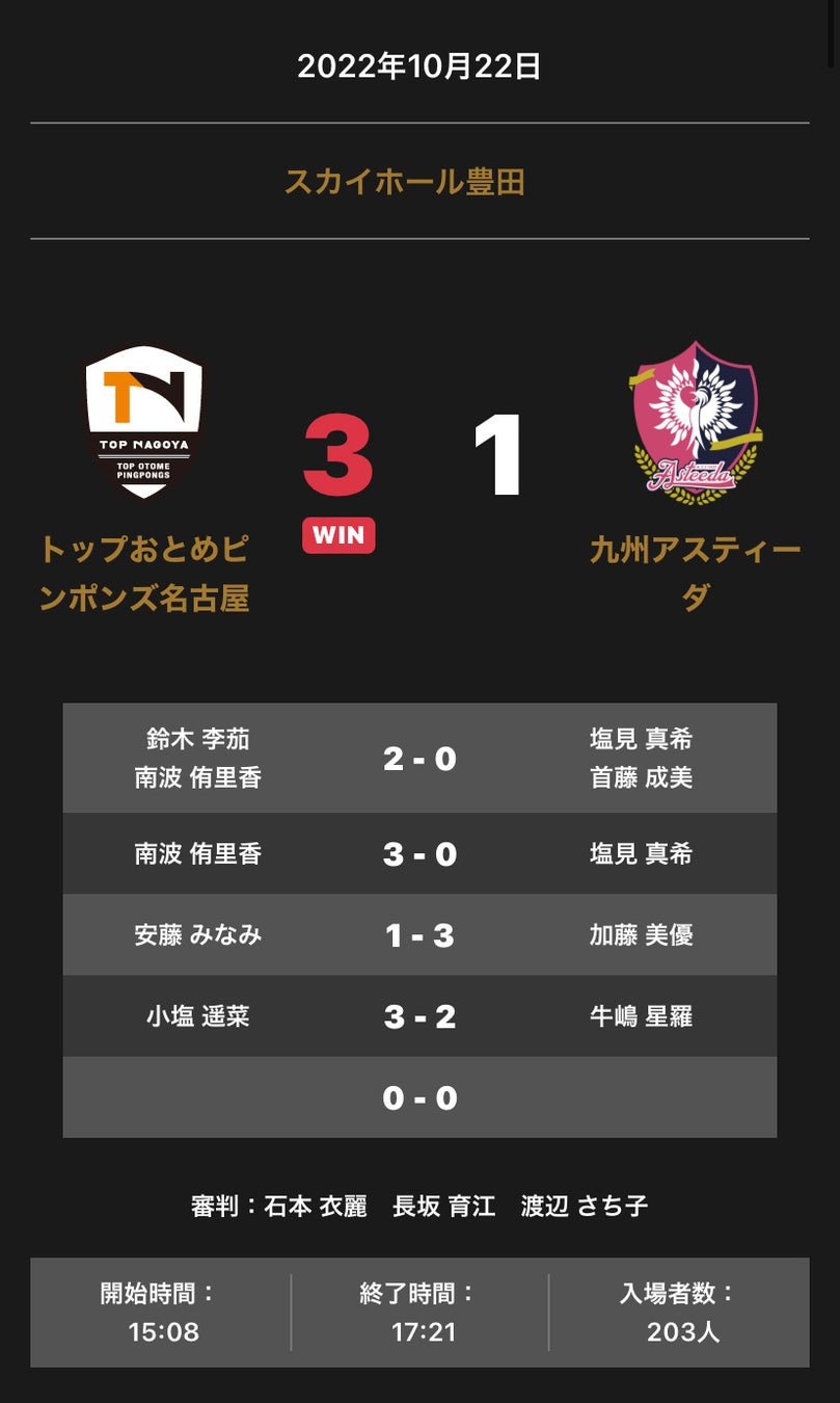 ノジマTリーグ 2022-2023シーズン 公式戦 10月22日開催 トップおとめピンポンズ名古屋 vs 九州アスティーダ 試合結果