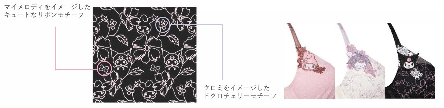 マイメロディ50周年、クロミ20周年というアニバーサリーイヤーを記念した特別なコレクションが誕生。ブラジャーには、それぞれのキャラクターの個性が光る3種類のアップリケをあしらい、花柄刺繍の中にはキャラクターのモチーフが隠れた、遊び心たっぷりのデザインに仕上げました。ナイトブラやブラトップには、水彩タッチのプリントを採用し、リラックスタイムにもときめきをプラス。