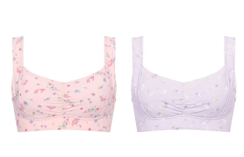 今回のコラボレーションではナイトブラとブラトップも登場。やさしい雰囲気の水彩画風の花柄に、さまざまな表情のマイメロディとクロミのデザインが散りばめられており、就寝時やおうち時間を心地よく彩ります。リラックスしながらも、気分がふっと上がるようなデザインです。