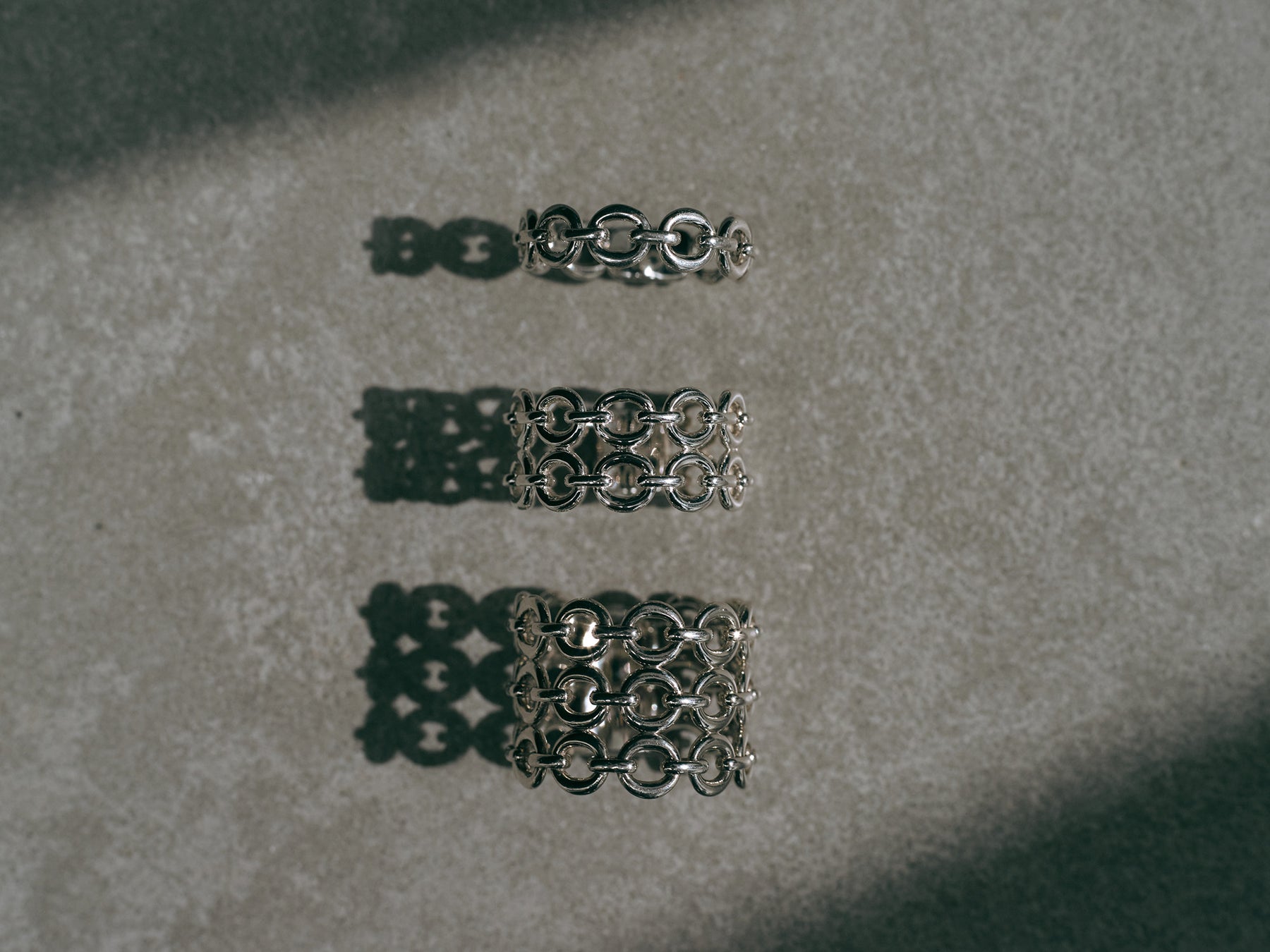 中世ヨーロッパの騎士が防具として身に着けていた輪を繋げて編み上げたチェインメイル(鎖帷子)がモチーフのMAILSシリーズのリングは、丸いフォルムと滑らかな着け心地にこだわったデザインが魅力のブランドを代表する人気アイテム。身に着けることで、自身を護ってくれるような安心感が生まれます。