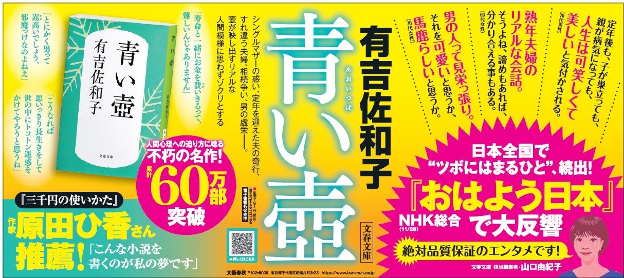 株式会社文藝春秋(本社:東京都千代田区、社長:飯窪成幸)は、このたび、有吉佐和子の小説『青い壺』(文春文庫)を10万部重版し、同作は累計60万部を突破しました。