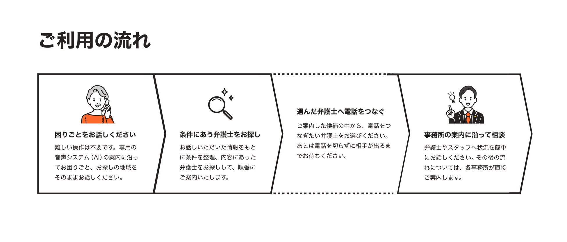 このたび新たに提供を開始した音声AIを活用した「弁護士ドットコム ホットライン(β)」は、電話一本で相談の条件にあった弁護士に関する情報の提供と、法律事務所への転送までを一気通貫で行える日本初(※4)のサービスです。