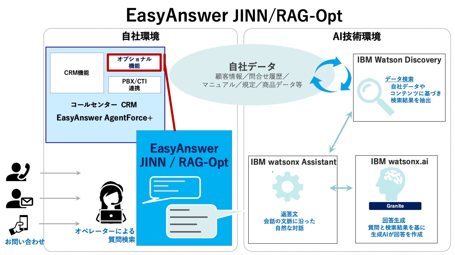 こうした中、従来よりディアイスクエアでは企業のコールセンター業務を支援する「EasyAnswer Series」を開発・提供し、コールセンター業務の様々な課題解決に向けて支援してきました。そして今回、ディアイスクエアは、コールセンター業務の更なる生産性向上に向け、「EasyAnswer Series」のオプショナル機能として、コールセンターを運営する事業会社にある顧客情報や問い合わせ履歴、マニュアル、各種規定、商品データなどの自社データと、IBMが提供する最新のAI技術を連携させることで、過去の対応履歴を有効活用して効率的に検索し、適切な回答を瞬時に提示できるサービス「EasyAnswer JINN/RAG-Opt」を開発しました。