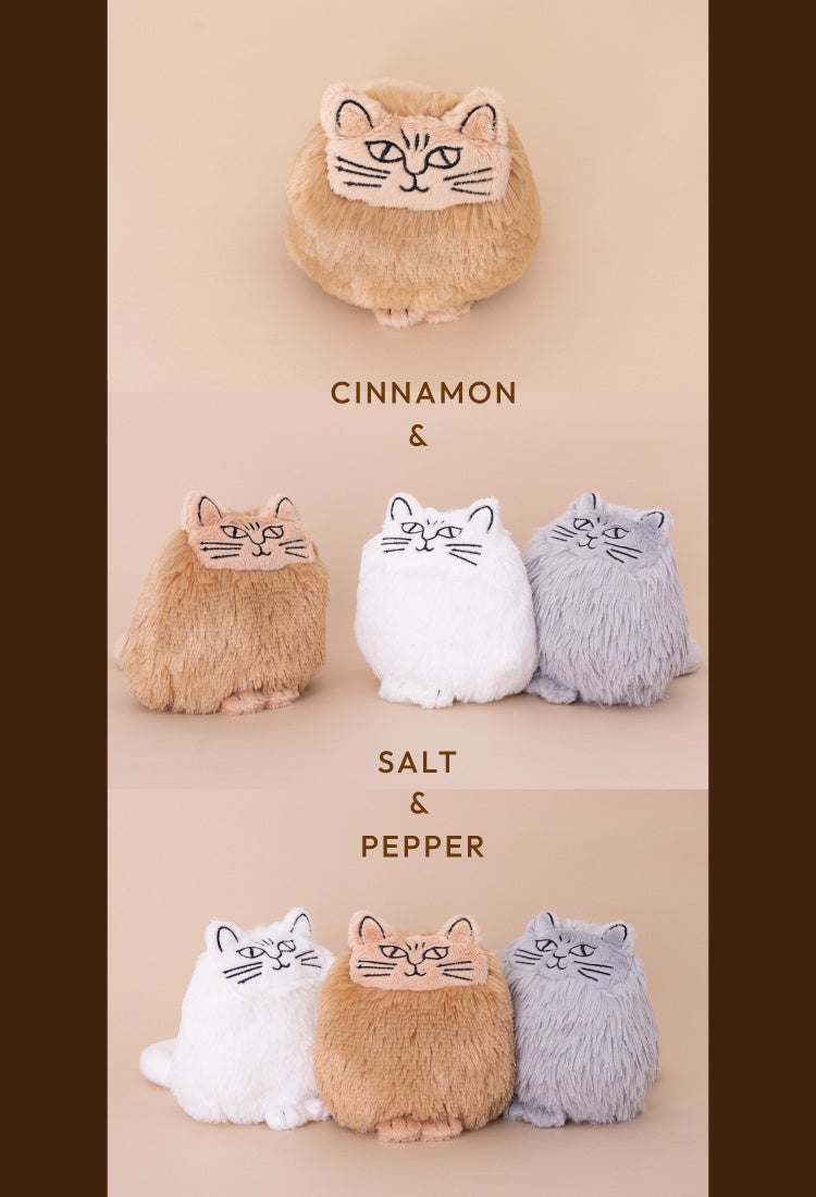 1965年に1年間だけ製造された希少な猫の陶器を、ふわふわのぬいぐるみとして現代によみがえらせました。長らく品切れだったソルトとペッパーもついに再販。さらに、待望の新しい仲間としてシナモンも登場します。