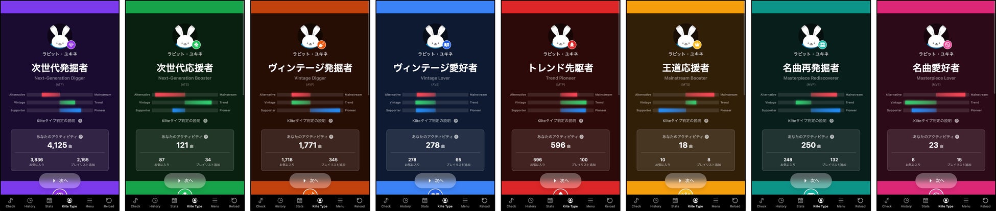 次世代発掘者、トレンド先駆者、名曲愛好者などの「リスナーのタイプ」の診断結果が表示される