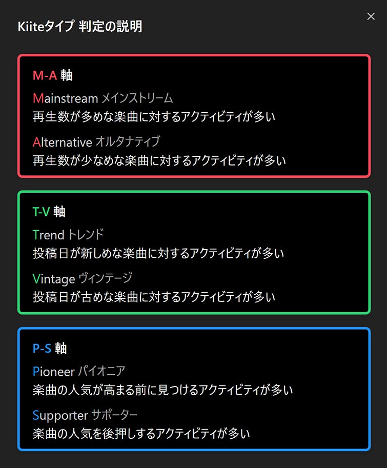 10曲をチェックし終わると、自分の「リスナーのタイプ」の診断結果が図2(a)のように「Kiiteタイプ」として表示される。これは、Kiiteでお気に入りやプレイリスト追加をしたすべてのアクティビティが、図2(b)の再生数(M-A軸)、投稿日(T-V軸)、人気(P-S軸)の三つの観点(軸)で分析された結果に基づいている。各軸でどちらのアクティビティが多いかが三つの横棒グラフで表示され、それらから図2(a)の8種類のKiiteタイプが判定される。例えば図2(a)の左端のように、再生数が少なめを好み(A)、投稿日が新しめを好み(T)、人気が高まる前に見つける(P)ような視聴傾向があるリスナーだと、「次世代発掘者」(ATP)となる。さらに最近2週間のアクティビティがあるリスナーの場合には、その期間のみの分析結果に基づく短期的な8種類の判定と、前述の長期間な8種類の判定を組み合わせた64種類の複合的なKiiteタイプが判定される。例えば図2(c)の右端の「次世代の楽曲も発掘する名曲再発掘者」(MVP-ATP)は、長期的にはMVPだが、三つの軸の下の白色の横棒グラフが最近2週間のアクティビティに基づく分析結果を示していて、それに基づくと短期的にはATPと判定されている。