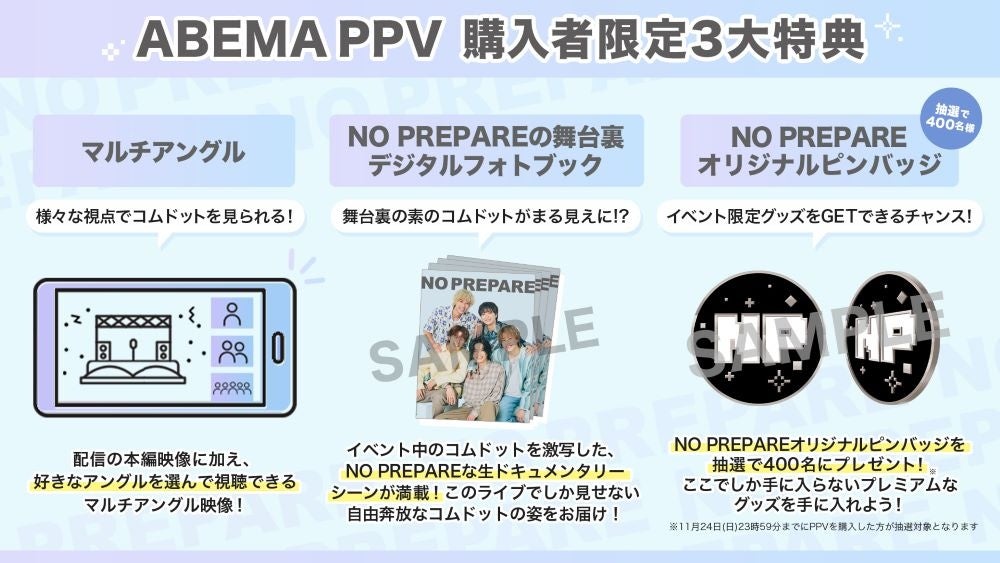 なお、本イベントは「ABEMA PPV」にて独占生配信することが決定しており、10月13日(日)18時より配信チケットの販売(※1)を開始いたします。各公演の配信チケットは3,000円(税込)、2DAYSの通しチケットは5,000円(税込)にてそれぞれ販売し、「ABEMA PPV」の購入者限定特典として、イベントのここが見たい!を追い求めたファン必見の映像アングルで、メインカメラに加えて好きなアングルを自分で選びながら配信を視聴することができるマルチアングル機能(※2)をお楽しみいただけるほか、イベント当日のステージや舞台裏の様子を収めた「NO PREPAREの舞台裏デジタルフォトブック(※3)」のプレゼント、そしてイベントのロゴがデザインされたイベント限定グッズ「NO PREPAREオリジナルピンバッジ(※4)」を抽選で400名様にプレゼントいたします