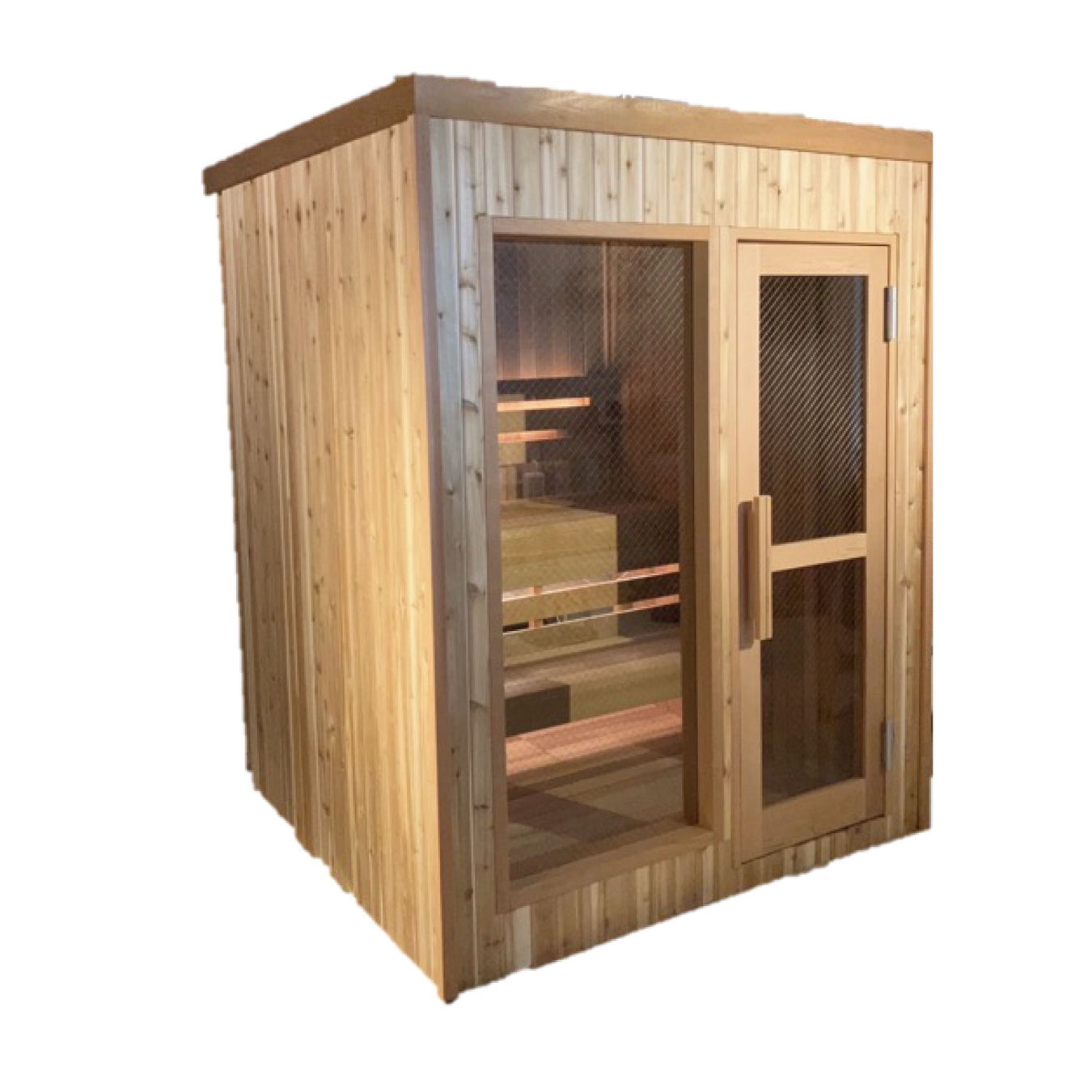 カナダの高級木材ウエスタンレッドシダーを使用。設置スペースに合わせてサイズや内装をカスタマイズ可能。