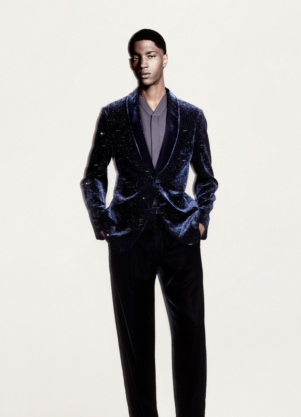 2024年秋冬シーズンは、ラインンストーンを胸元にあしらったミニマムなジャケットやベスト、ベルベットのロングコートや艶のあるサテン地のシャツなど、シグニチャーアイテムにコンテンポラリーなシルエットをのせた大人の男性のエレガンスを存分に味わえる豊富なバリエーションが揃います。
