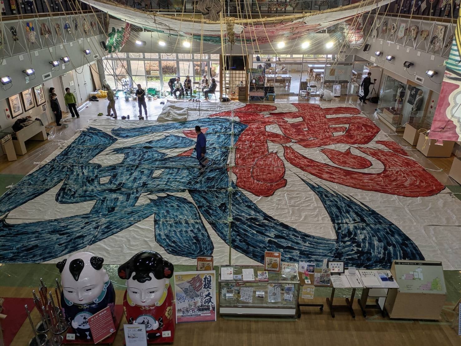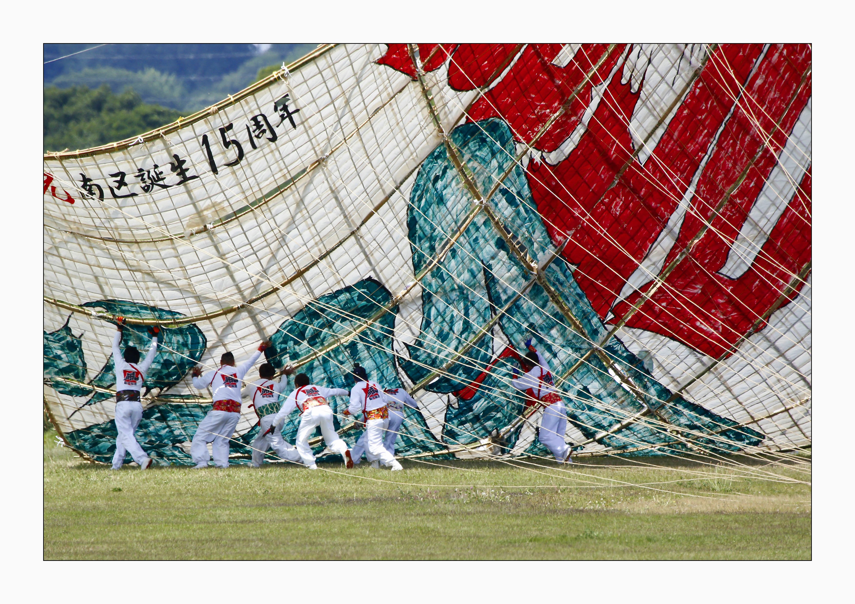 一般的に凧には絵や文字が描かれますが、「相模の大凧」では、その時々の世相を反映した漢字2文字が大凧の題字として書かれ、一文字目は太陽の赤、二文字目は大地の緑で表現されます。