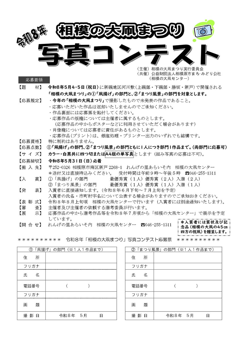 まつりの様子を撮影した写真で、写真コンテストに応募してみませんか?入賞作品は令和8年7月以降に「相模の大凧センター」で展示予定です。詳しくは下記チラシをご覧ください。